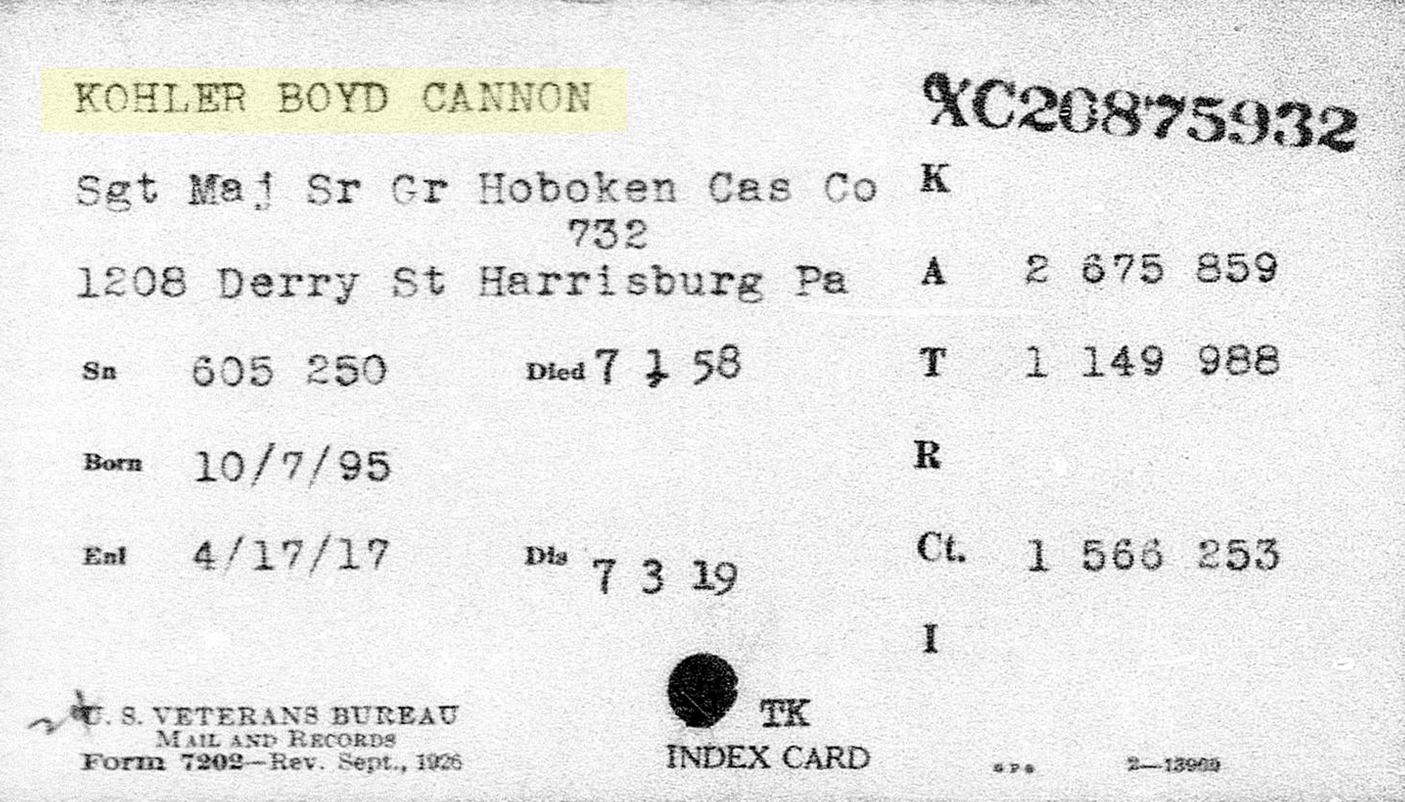 5 "United States, Veterans Administration Master Index, 1917-1940," database, FamilySearch (https://www.familysearch.org/search/collection/2968245 : accessed 24 Nov 2019), Boyd Cannon Kohler, 3 Jul 1919; citing Military Service, NARA microfilm publication 76193916 (St. Louis: National Archives and Records Administration, 1985), various roll numbers.