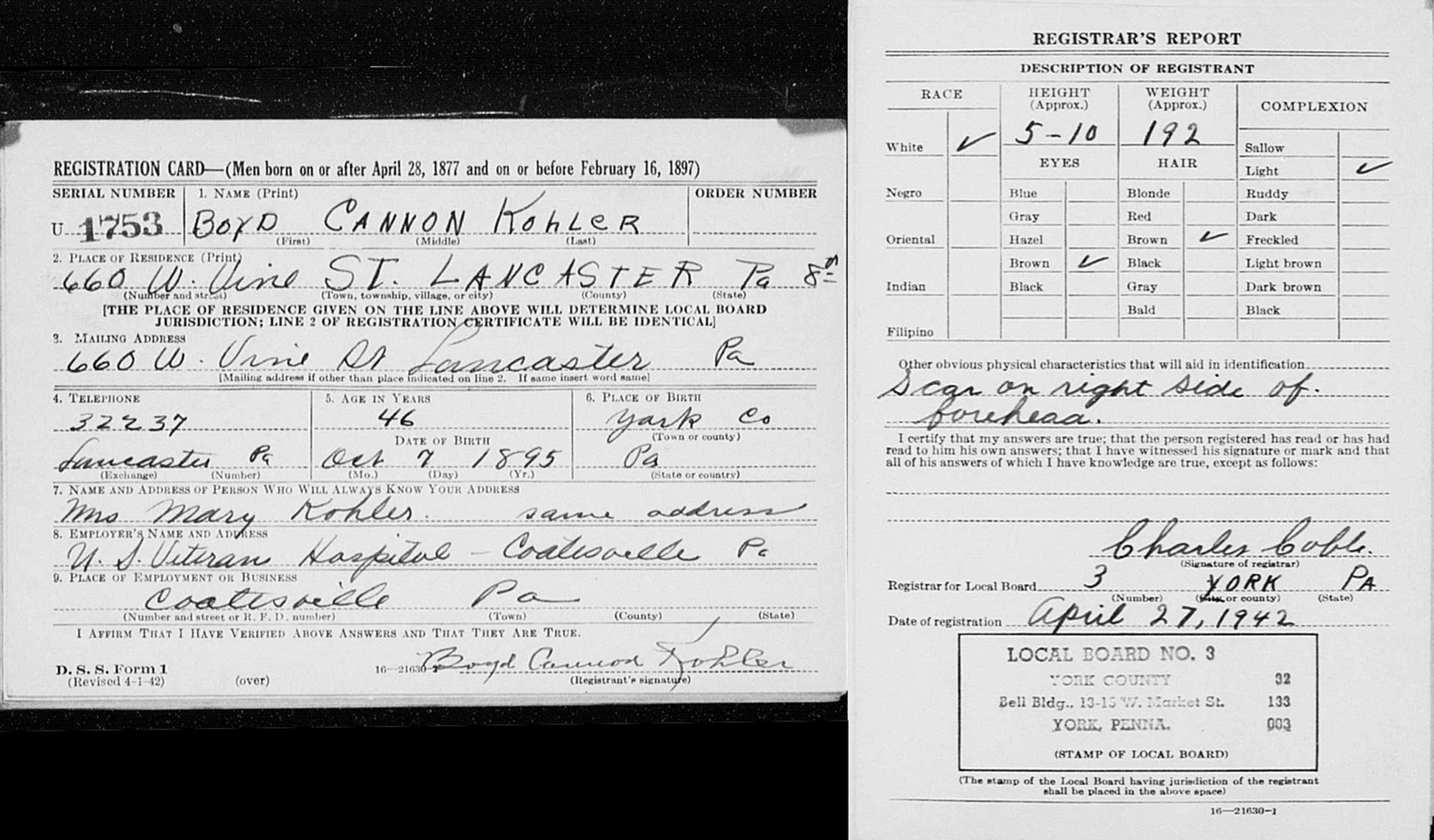 4 "United States World War II Draft Registration Cards, 1942," database with images, FamilySearch (https://familysearch.org/search/collection/1861144 : accessed 24 Nov 2019); Boyd Cannon Kohler, 1942; citing NARA microfilm publication M1936, M1937, M1939, M1951, M1962, M1964, M1986, M2090, and M2097 (Washington D.C.: National Archives and Records Administration, n.d.).