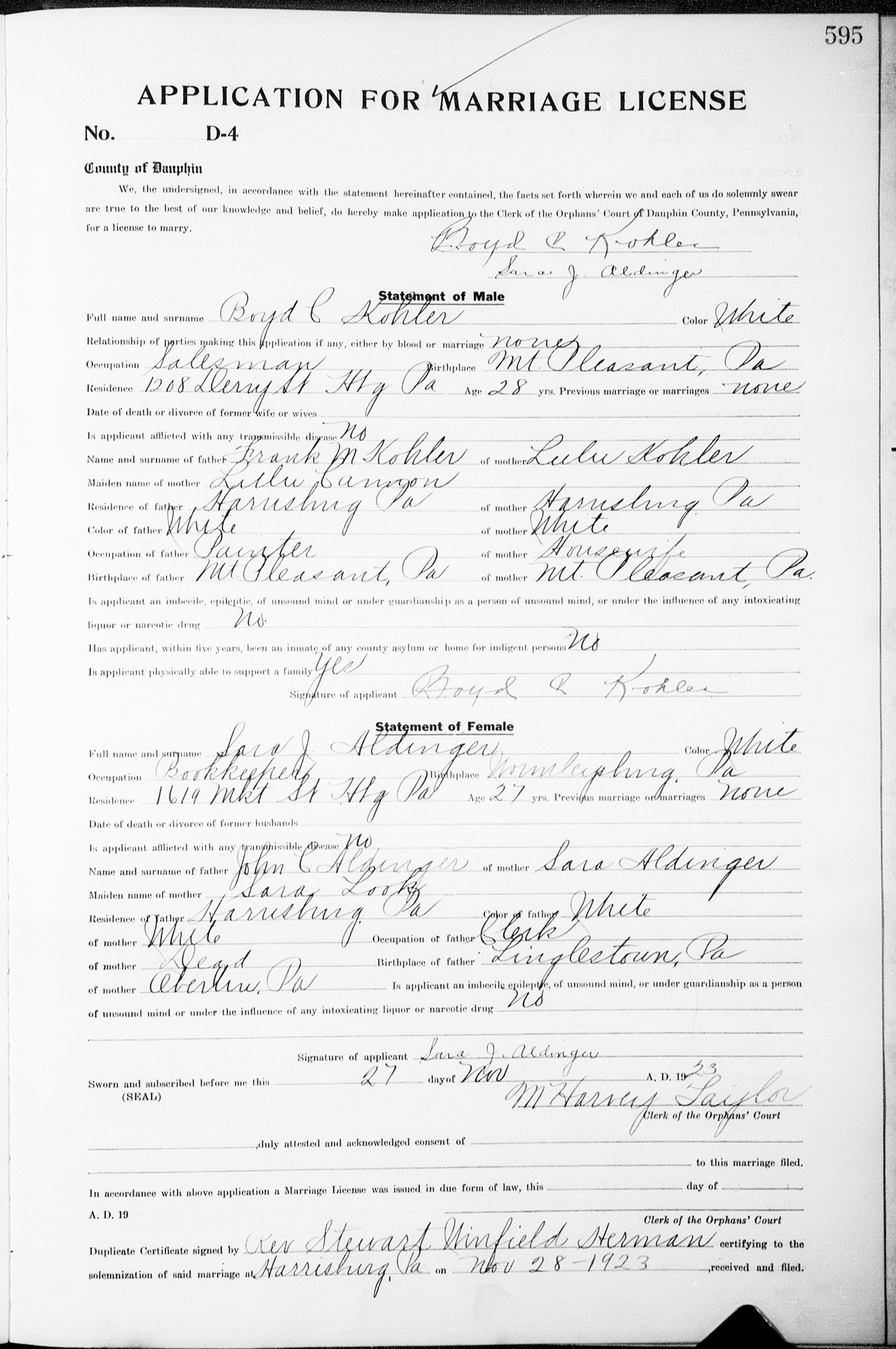 1 "Pennsylvania, County Marriages, 1885-1950," database with images, FamilySearch (accessed 24 Nov 2019); Boyd C Kohler and Sara J Aldinger, 28 Nov 1923; citing Marriage, Dauphin, Pennsylvania, United States, multiple County Clerks, Pennsylvania.