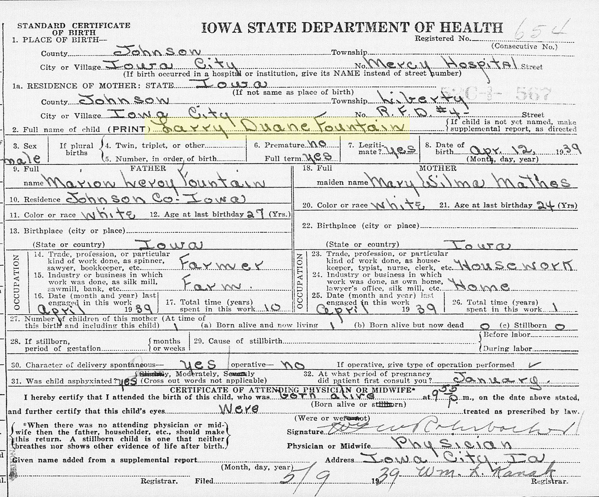 "Iowa, Birth Records, 1921-1942," database, FamilySearch (https://www.familysearch.org/search/collection/2849548 : accessed 24 October 2020), Larry Duane Fountain, 12 Apr 1939; citing Birth, Johnson, Iowa, United States, State Historical Society of Iowa, Des Moines.