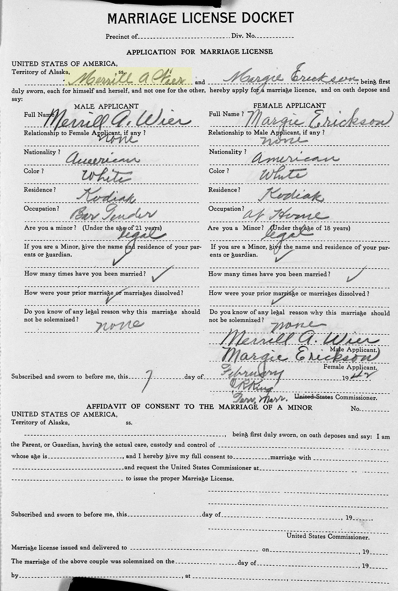 1 "Alaska, Vital Records, 1816-1959," database with images, FamilySearch (https://www.familysearch.org/search/collection/2216300 : accessed 13 Oct 2019), Merrill A Wier and Margie Erickson, Kodiak, Alaska, United States; citing Marriage, Kodiak, Alaska, United States, Alaska State Archives, Juneau; FHL microfilm 100,818,120.
