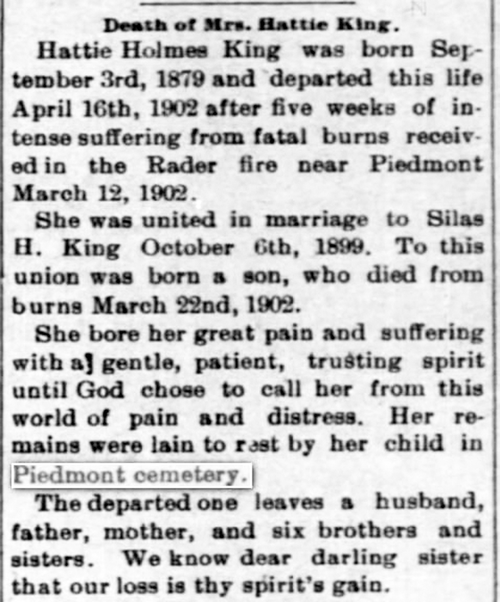 Find A Grave, database and images (https://www.findagrave.com/ ); accessed 30 April 2020, memorial page for Hattie Belle Holmes King (3 Sep 1879-16 Apr 1902), Find a Grave Memorial no. 54795588, citing Piedmont Cemetery, Piedmont, Greenwood County, Kansas, USA