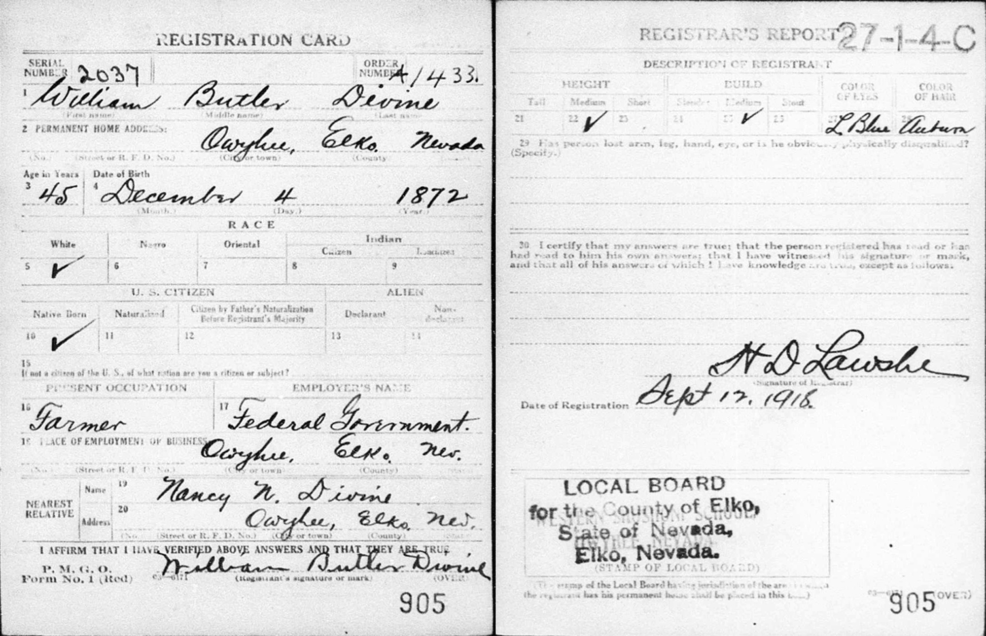 4 "United States World War I Draft Registration Cards, 1917-1918," database with images, FamilySearch.org (accessed 24 February 2021); William Butler Divine, 1917-1918.