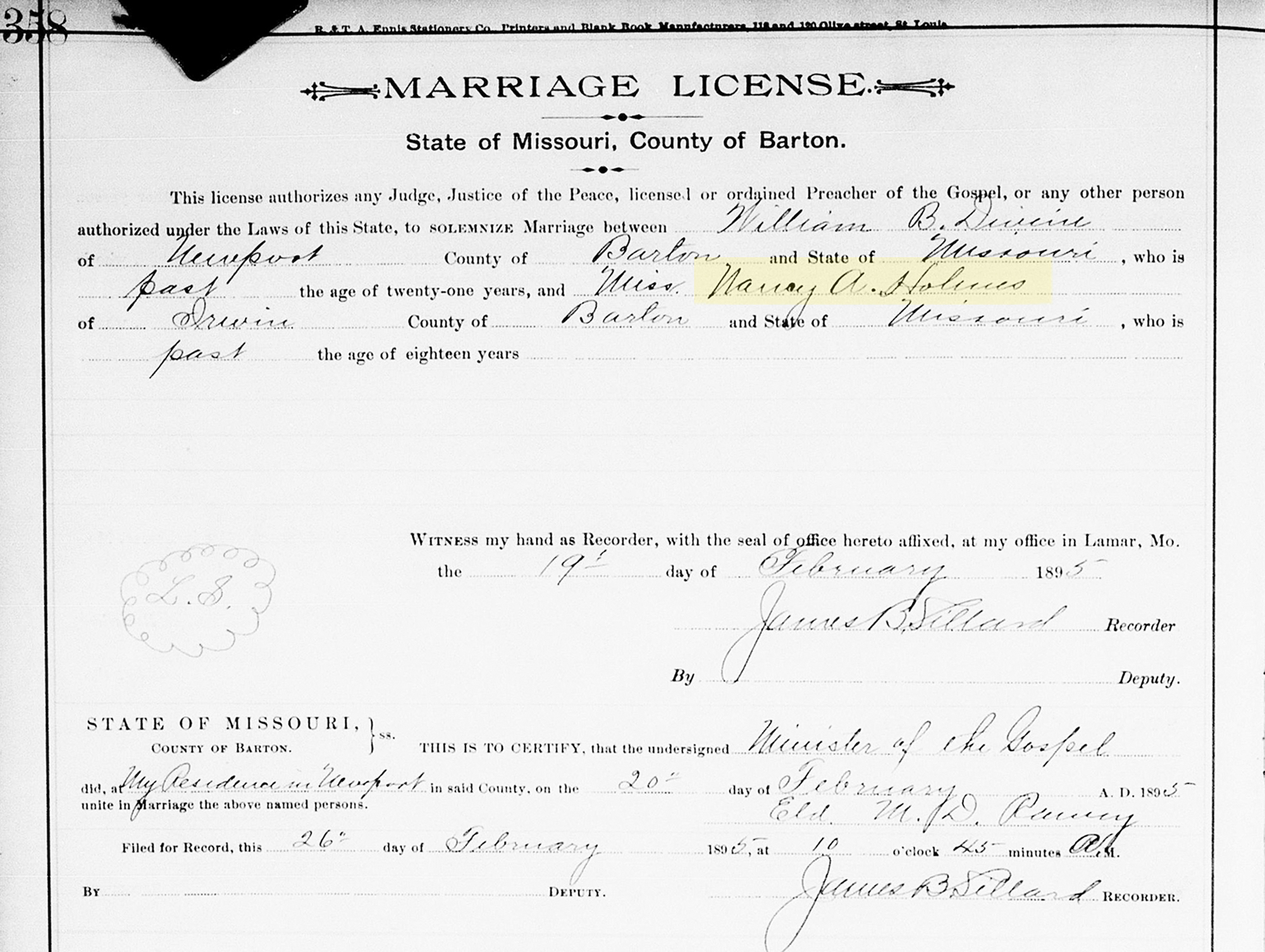 1 "Missouri, County Marriage, Naturalization, and Court Records, 1800-1991," database with images, FamilySearch (https://www.familysearch.org/search/collection/2060668 : accessed 28 Apr 2020), William B Divine, 20 Feb 1895; citing Marriage, Barton, Missouri, United States, Missouri State Archives, Jefferson City; FHL microfilm 007424461.