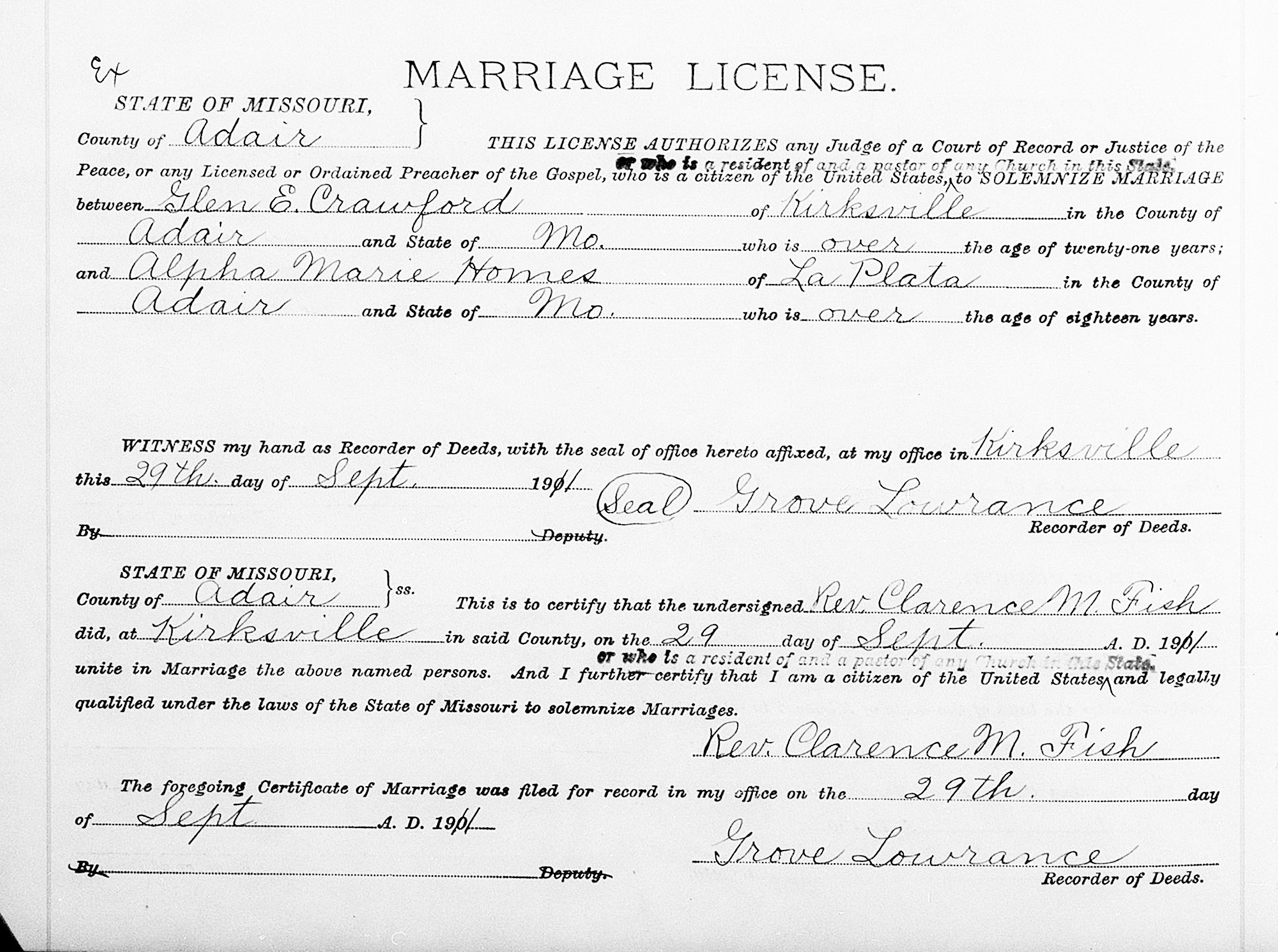 1 "Missouri, County Marriage, Naturalization, and Court Records, 1800-1991," database with images, FamilySearch (https://www.familysearch.org/search/collection/2060668 : accessed 14 May 2020), Glen E Crawford, 29 Sep 1911; citing Marriage, Adair, Missouri, United States, Missouri State Archives, Jefferson City; FHL microfilm 007425054.