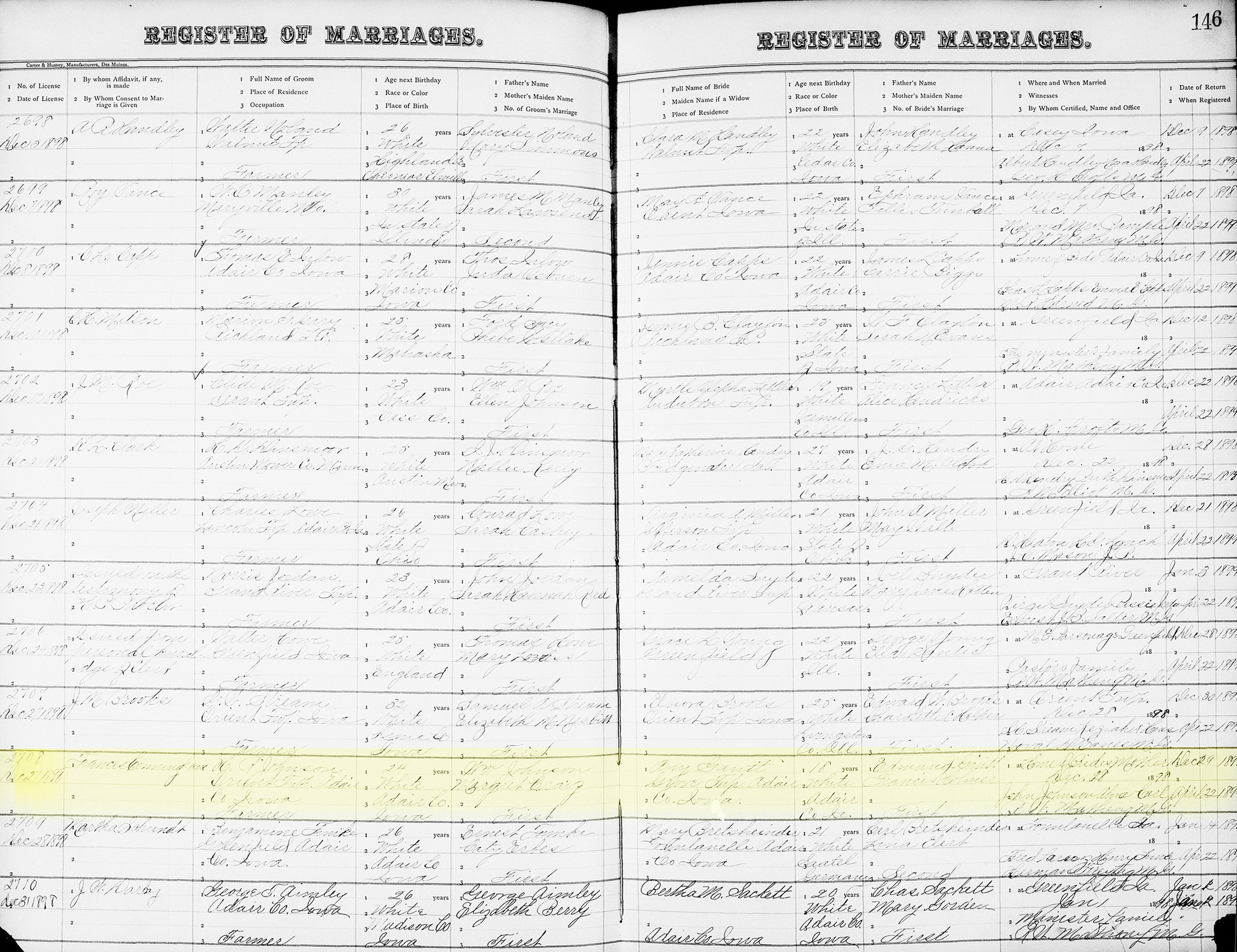 1 "Iowa, County Marriages, 1838-1934," database, FamilySearch (https://familysearch.org/search/collection/1805551 : accessed 19 May 2020), H. R. Johnson and Amy Gantt, 28 Dec 1898, Adair, Iowa; citing reference, county courthouses, Iowa; FHL microfilm 1,034,815.
