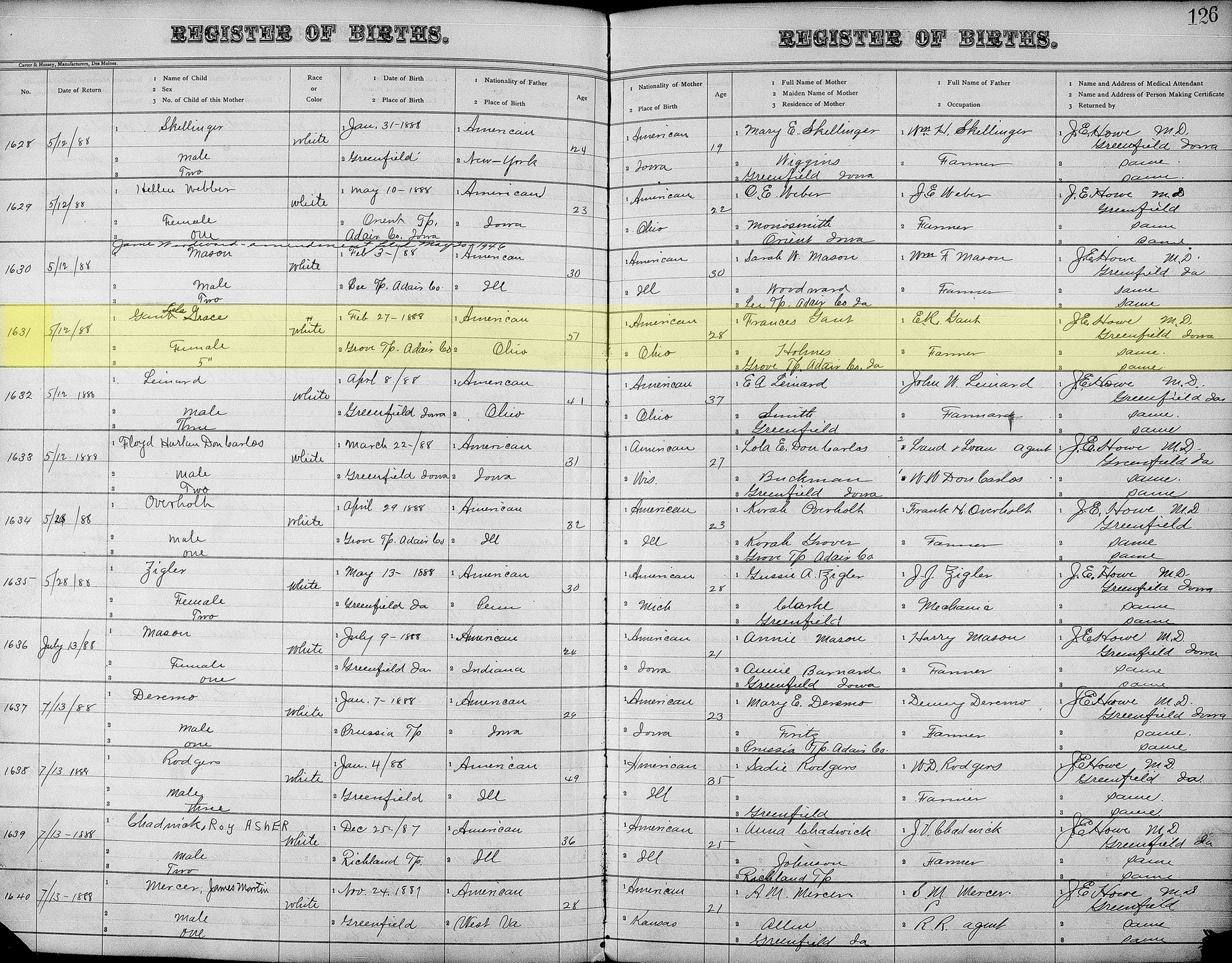 2 "Iowa, County Births, 1880-1935," database, FamilySearch (https://familysearch.org/search/collection/1821206 : accessed 23 May 2020), Lela Grace Gant, 27 Feb 1888; citing Iowa, United States; county district courts, Iowa; FHL microfilm 1,034,814.