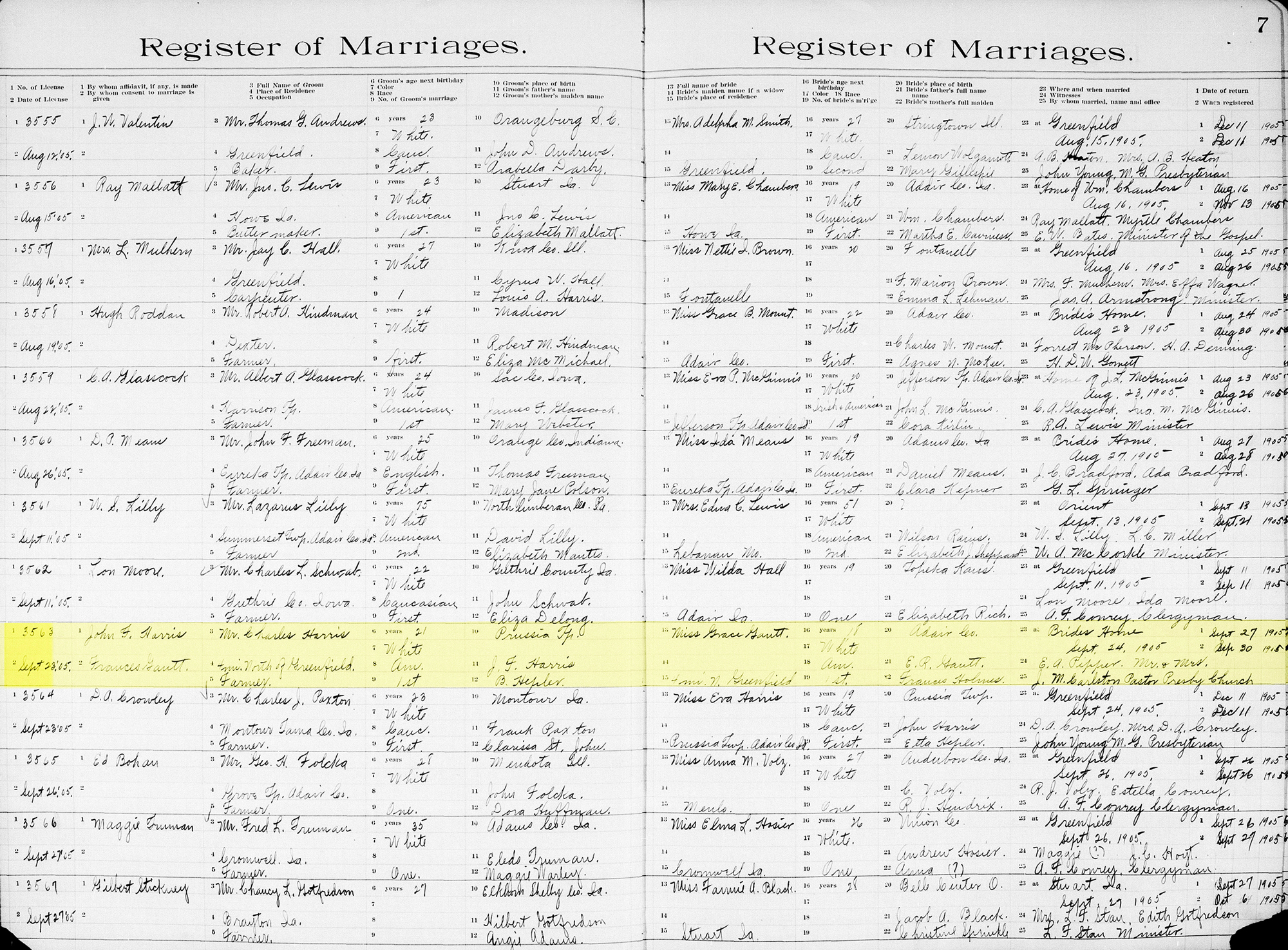 1 "Iowa, County Marriages, 1838-1934," database, FamilySearch (https://familysearch.org/search/collection/1805551 : accessed 23 May 2020), Charles Harris and Grace Gantt, 24 Sep 1905, Adair, Iowa; citing reference p7, county courthouses, Iowa; FHL microfilm 1,034,819.
