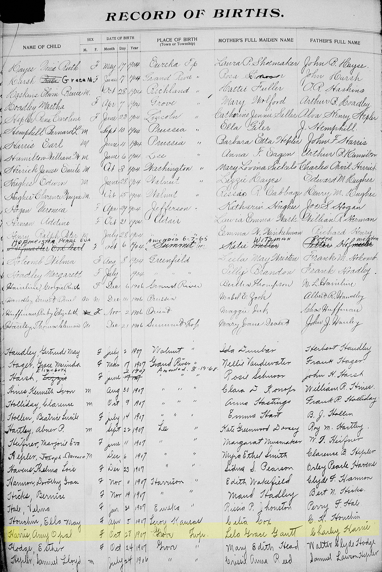 "Iowa, County Births, 1880-1935," database, FamilySearch (https://familysearch.org/search/collection/1821206 : accessed 23 May 2020), Amy Opal Harris, 28 Oct 1907; citing Iowa, United States; county district courts, Iowa; FHL microfilm 1,034,815.