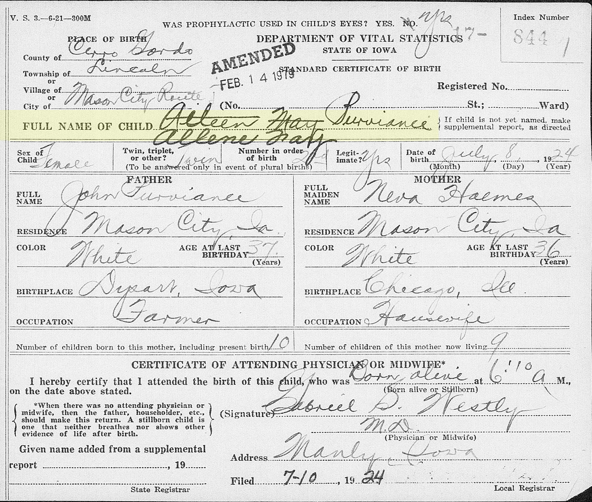 1 "Iowa, Birth Records, 1921-1942," database, FamilySearch (https://www.familysearch.org/search/collection/2849548 : accessed 25 May 2020), Allene Fay Purviance, 8 Jul 1924; citing Birth, Lincoln Township, Cerro Gordo, Iowa, United States, State Historical Society of Iowa, Des Moines.