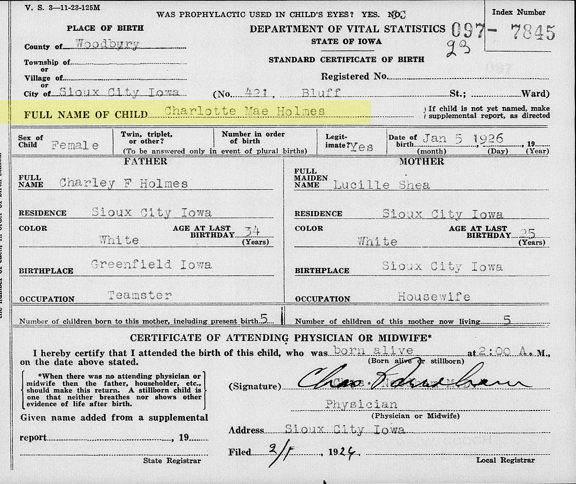 1 "Iowa, Birth Records, 1921-1942," database, FamilySearch (https://www.familysearch.org/search/collection/2849548 : accessed 26 May 2020), Charlotte Mae Holmes, 5 Jan 1926; citing Birth, Sioux City, Woodbury, Iowa, United States, State Historical Society of Iowa, Des Moines.