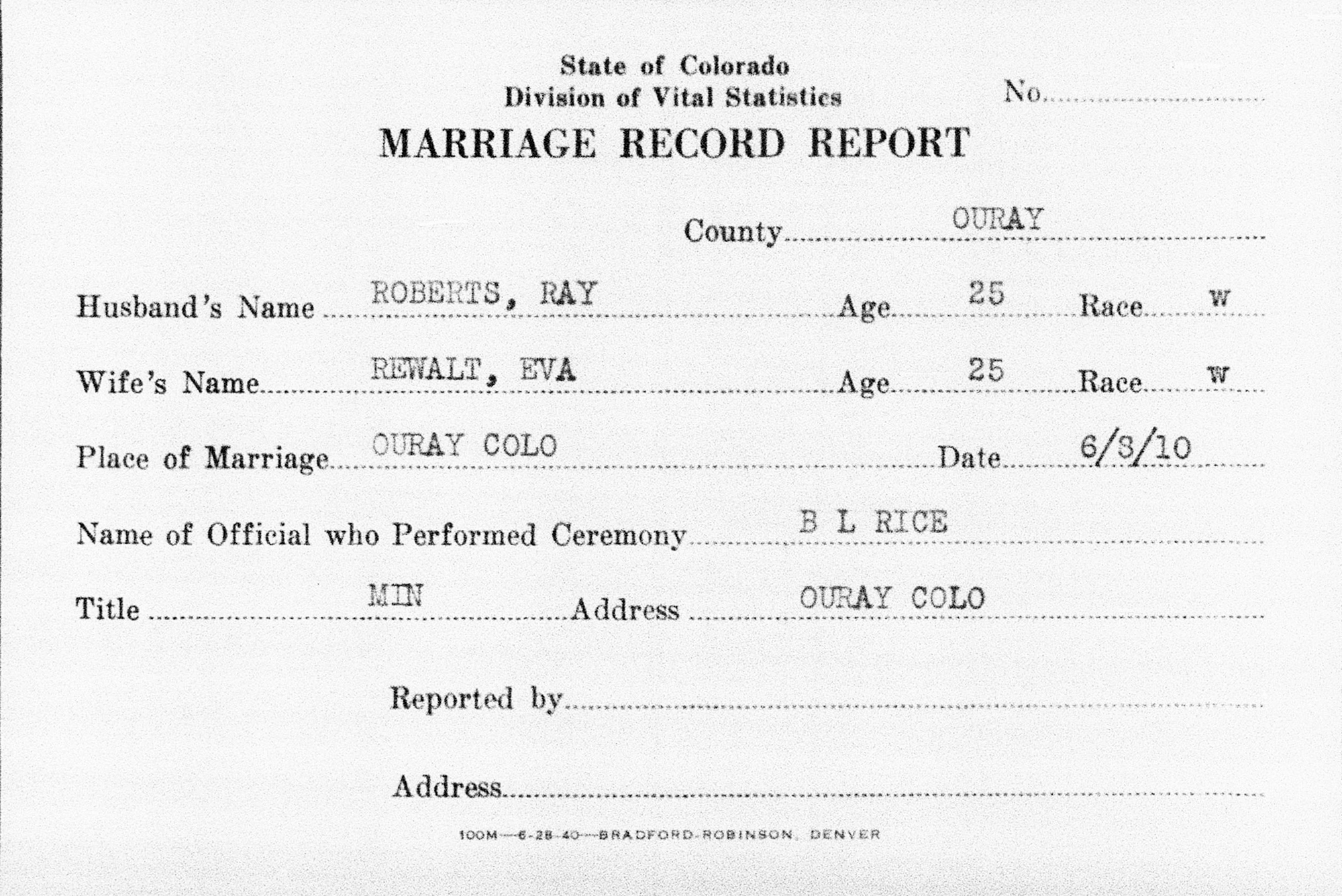 1 "Colorado Statewide Marriage Index, 1853-2006," database with images, FamilySearch (https://familysearch.org/search/collection/1932434 : accessed 1 Jun 2020); Ray Roberts and Eva Rewalt, 08 Jun 1910, Ouray, Ouray, Colorado; citing no., State Archives, Denver; FHL microfilm 1,690,127.