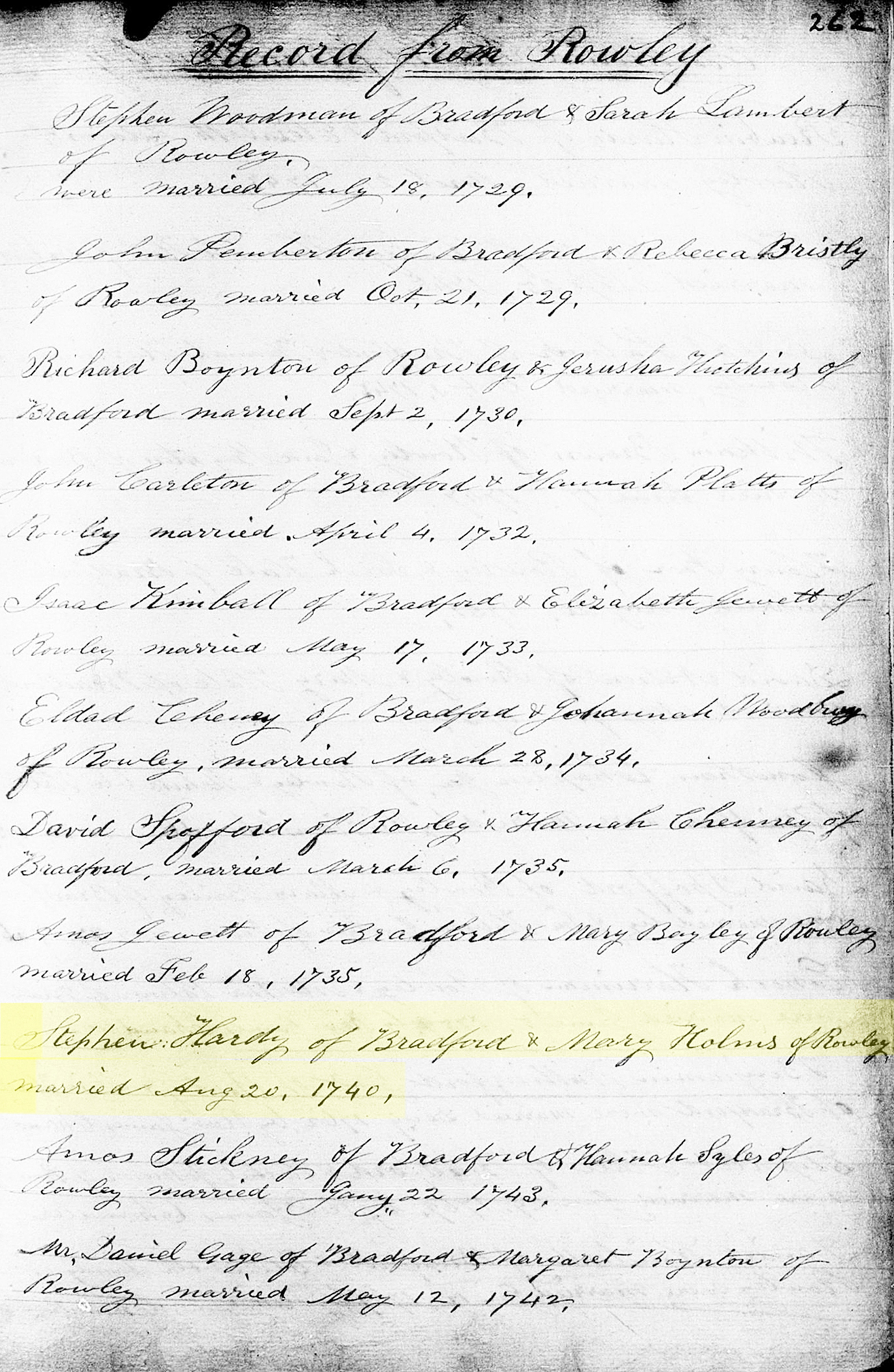 1 "Massachusetts Marriages, 1695-1910," database, FamilySearch (https://www.familysearch.org/search/collection/1675351 : accessed 23 Jun 2020), Stephen Hardy, 1740.