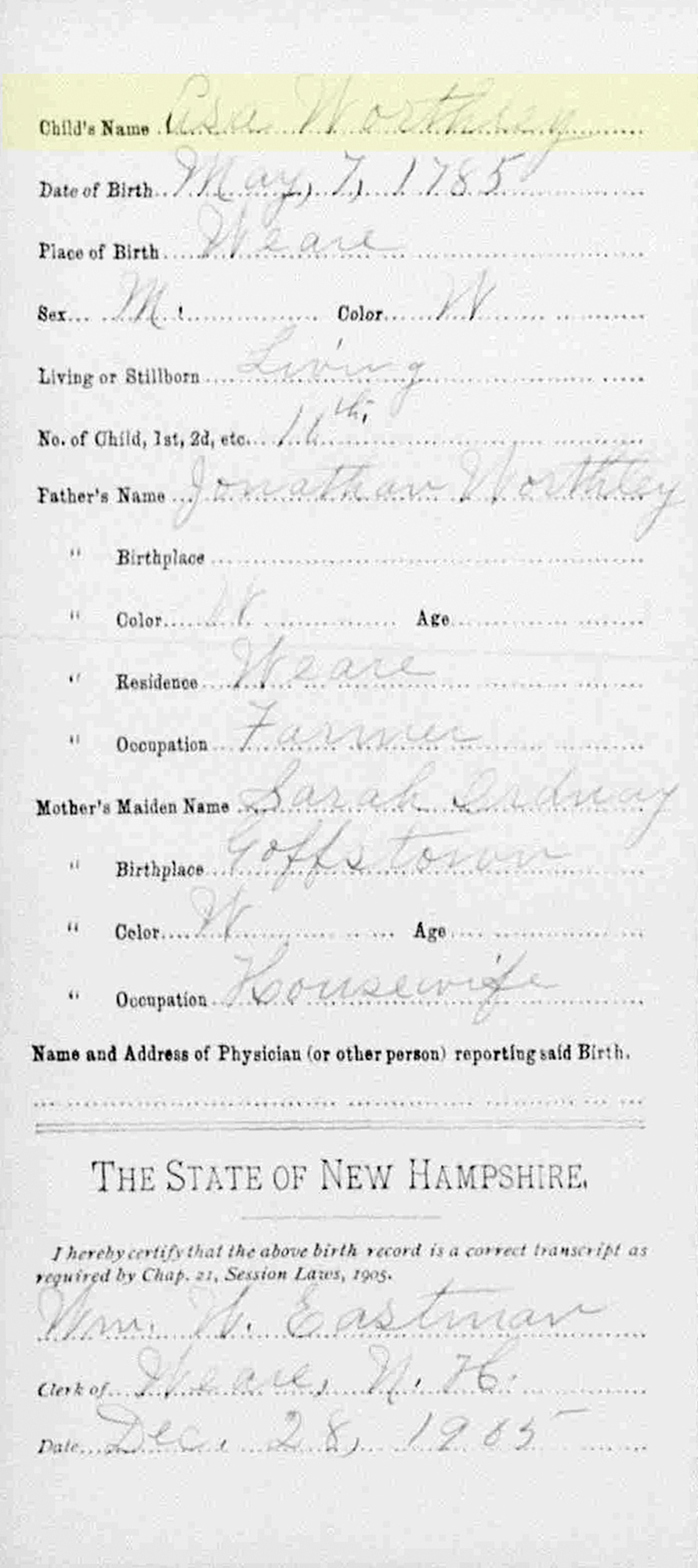 Name: Asa Worthley Race: W Birth Date: 07 May 1785 Birthplace: Weare, Hillsborough, New Hampshire, United States Father's Name: Jonathan Worthley Mother's Name: Sarah Ordnay Digital Folder Number: 004244324 Record Number: 3819