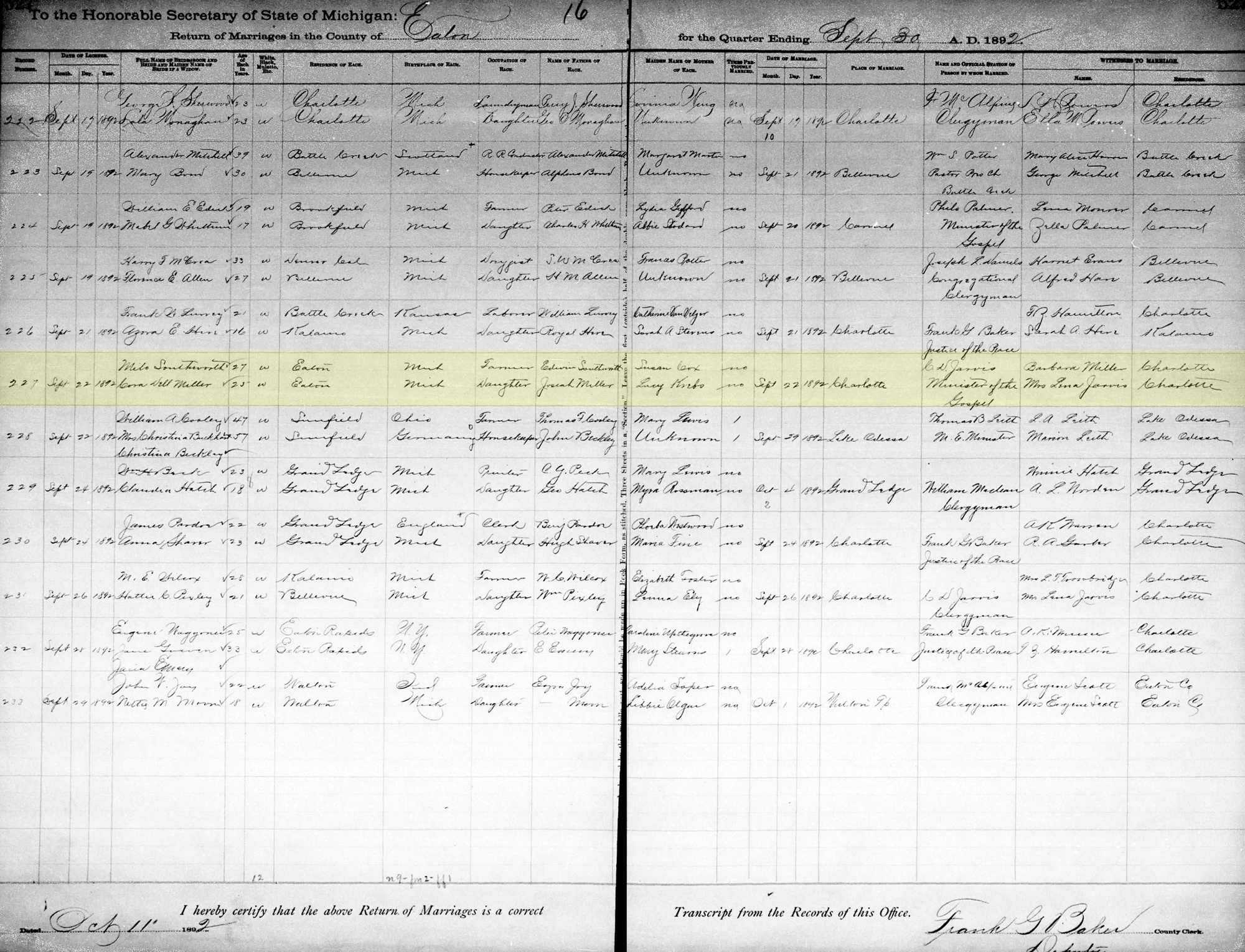 • Marriage Image: 22 September 1892, in Charlotte, MI. 1 • They appeared on the 1900 US Census in Eaton Township, Eaton, MI on 4 June 1900. 2 • They appeared on the 1910 US Census in Eaton Township, Eaton, MI on 25 April 1910. 3 • They appeared on the 1920 US Census in Eaton Township, Eaton, MI on 26 January 1920. 4