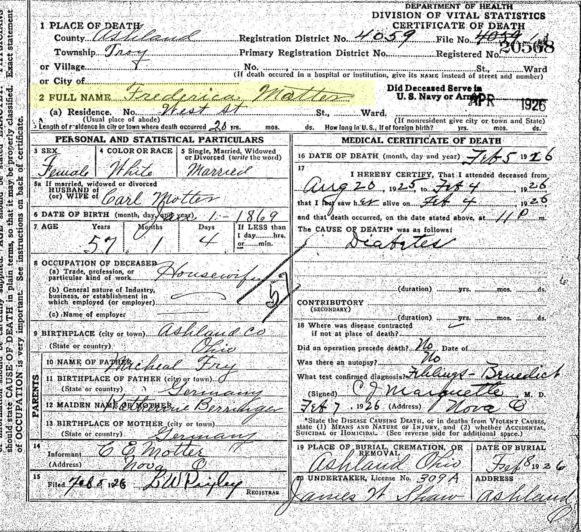 5 "Ohio Deaths, 1908-1953," database with images, FamilySearch.org (accessed 19 May 2021), (https://www.familysearch.org/ark:/61903/1:1:X8JJ-1DZ : 19 May 2021), Frederica Motter, 05 Feb 1926; citing Troy Twp., Ashland, Ohio, reference fn 20568; FHL microfilm 1,984,197.