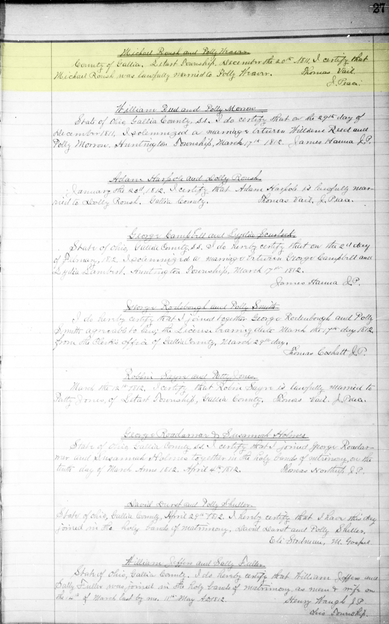 1 "Ohio, County Marriages, 1789-2016," database with images, FamilySearch.org (accessed 2 September 2021); (https://familysearch.org/ark:/61903/1:1:XD4V-69H : 8 March 2021), Michael Roush and Polly Weaver, 20 Dec 1811; citing Marriage, Gallia, Ohio, United States, p27, Franklin County Genealogical & Historical Society, Columbus; FHL microfilm.