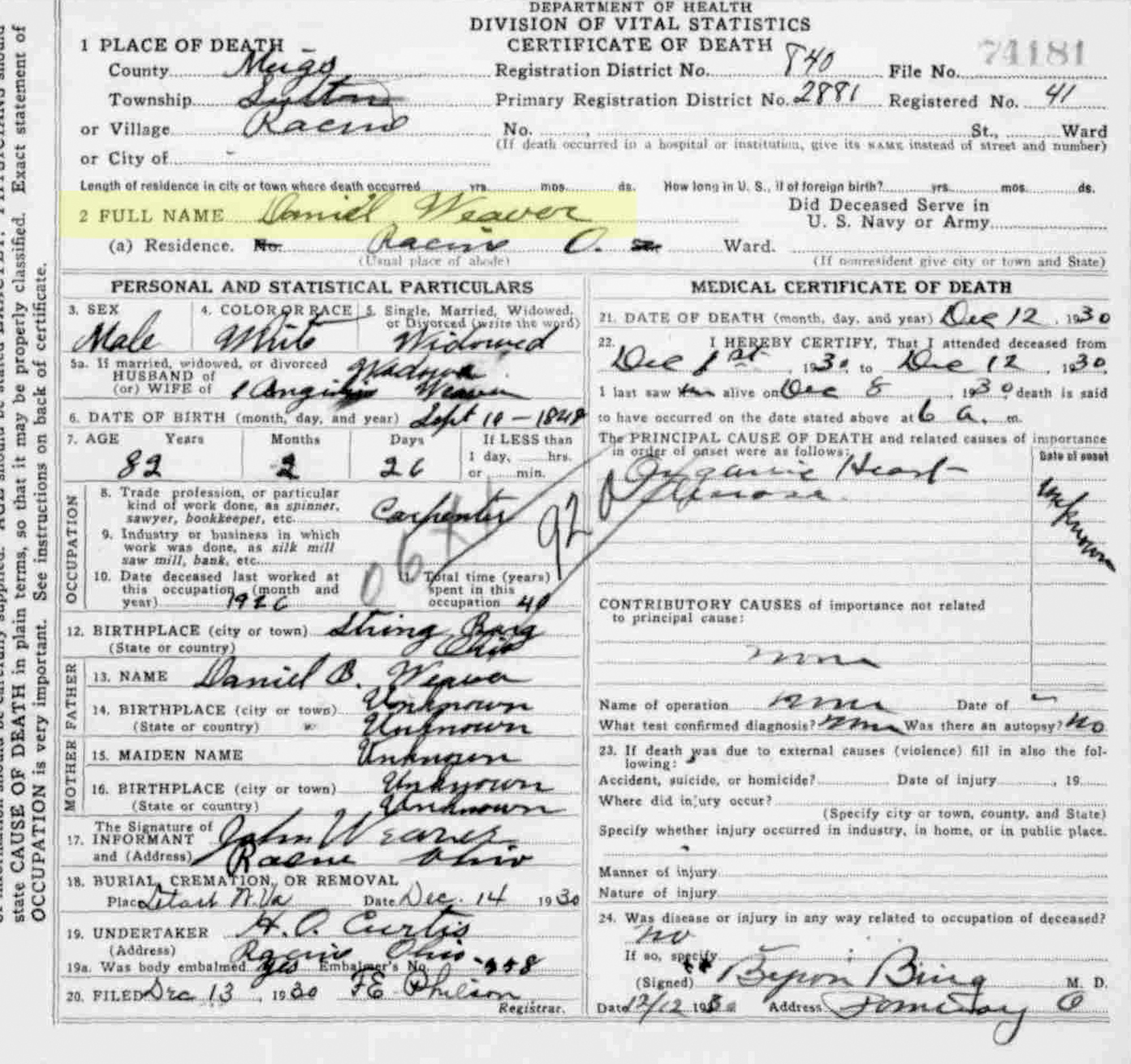 "Ohio Deaths, 1908-1953," database with images, FamilySearch.org (accessed 25 September 2021), (https://familysearch.org/ark:/61903/1:1:X6ZT-PY6 : 8 March 2021), Daniel Weaver, 12 Dec 1930; citing Racine, Meigs, Ohio, reference fn 74181; FHL microfilm 1,992,281.