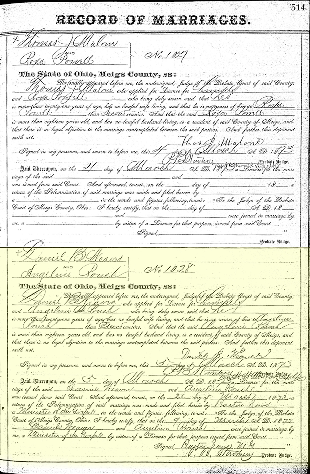1 "Ohio, County Marriages, 1789-2016," database with images, FamilySearch.org (accessed 24 September 2021); (https://familysearch.org/ark:/61903/1:1:XZHF-YTL : 8 March 2021), Daniel B. Weaver and Angeline Roush, 09 Mar 1873; citing Marriage, Meigs, Ohio, United States, cn1028 pg.514, Franklin County Genealogical & Historical Society, Columbus; FHL microfilm.