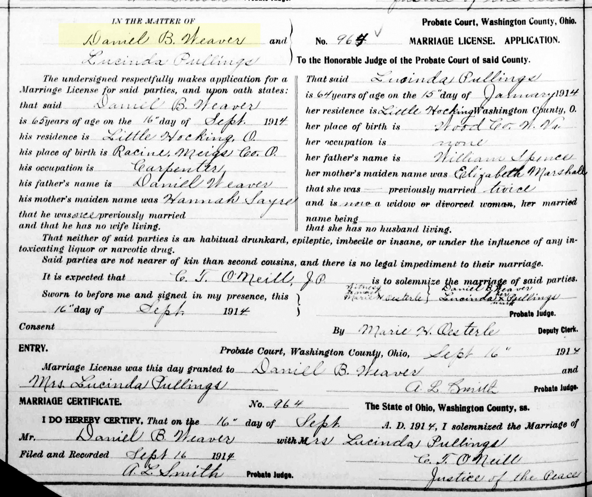 4 "Ohio, County Marriages, 1789-2016," database with images, FamilySearch.org (accessed 25 September 2021); (https://familysearch.org/ark:/61903/1:1:X8QD-KTD : 8 March 2021), Daniel B. Weaver and Lucinda Pullings, 16 Sep 1914; citing Marriage, Washington, Ohio, United States, p 482 cn 964, Franklin County Genealogical & Historical Society, Columbus; FHL microfilm.