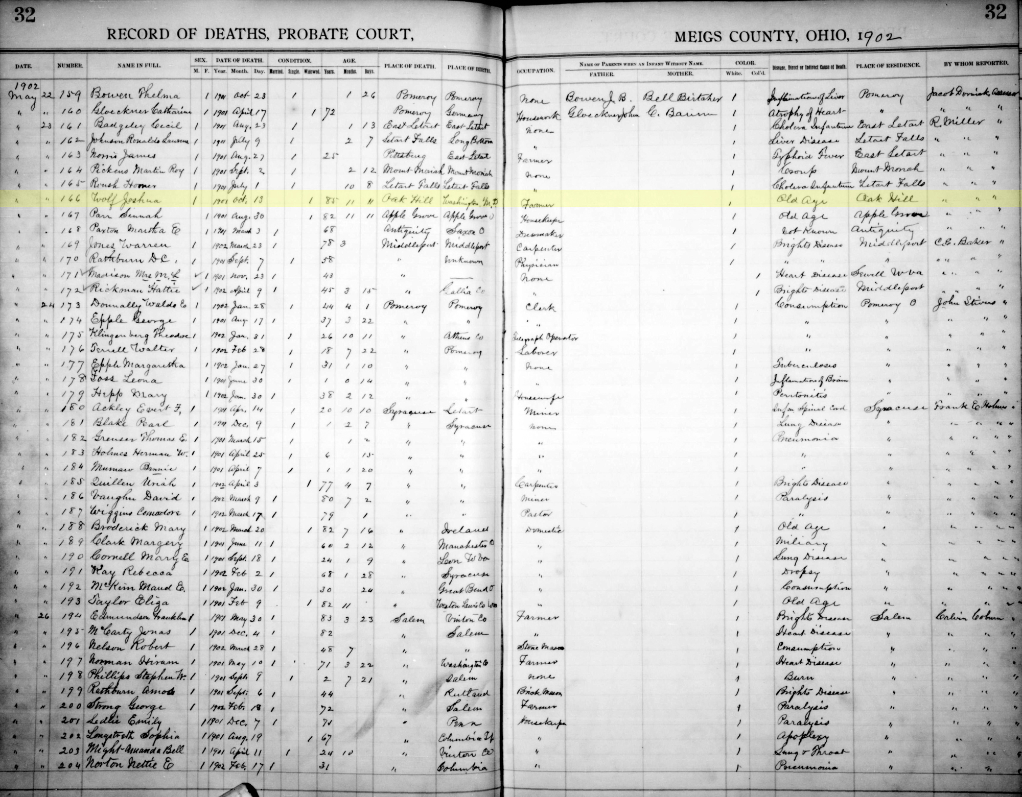 "Ohio, County Death Records, 1840-2001," database with imagers, FamilySearch.org (accessed 18 September 2021); (https://familysearch.org/ark:/61903/1:1:F6JR-Q4S : 1 March 2021), Joshua Wolf, 13 Oct 1901; citing Death, Oak Hill, Meigs, Ohio, United States, source ID v 2 p 32 fn 166, County courthouses, Ohio; FHL microfilm 313,469.
