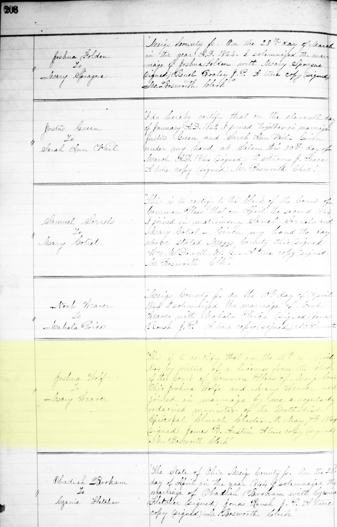 1 "Ohio, County Marriages, 1789-2016," database with images, FamilySearch.org (accessed 17 September 2021); (https://familysearch.org/ark:/61903/1:1:XZ2V-8FH : 8 March 2021), Joshua Wolf and Mary Weaver, 18 Apr 1844; citing Marriage, Meigs, Ohio, United States, Franklin County Genealogical & Historical Society, Columbus; FHL microfilm.