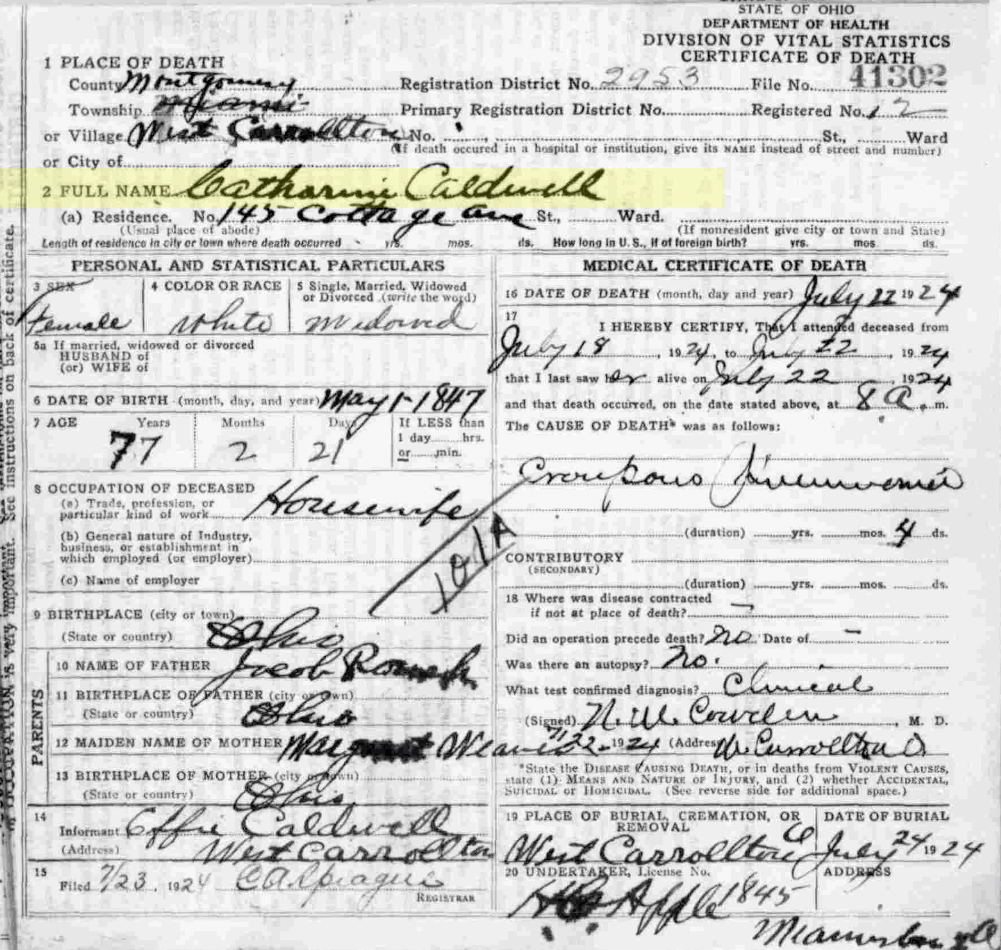 9 "Ohio Deaths, 1908-1953," database with images, FamilySearch.org (accessed 14 October 2021), (https://familysearch.org/ark:/61903/1:1:X64P-FHW : 8 March 2021), Catharine Caldwell, 22 Jul 1924; citing West Carrolton, Montgomery, Ohio, reference fn 41302; FHL microfilm 1,992,502.