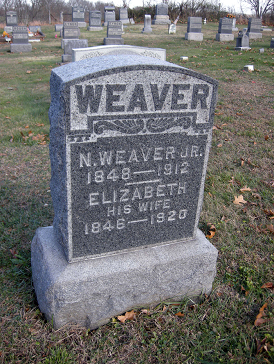 • She was buried after 7 July 1920 in the Union Cemetery in , Mason, West Virginia, United States. Elizabeth married Nicholas Weaver Jr, son of Nicholas Weaver and Dorothy Roush, in 1869 in , Mason, West Virginia, United States.1 2 3 4 5 (Nicholas Weaver Jr was born in May 1848 in , Mason County, VA,2 3 6 9 10 died on 14 October 1912 in New Haven, WV 11 and was buried after 14 October 1912 in Union Cemetery, Mason County, WV 10.)