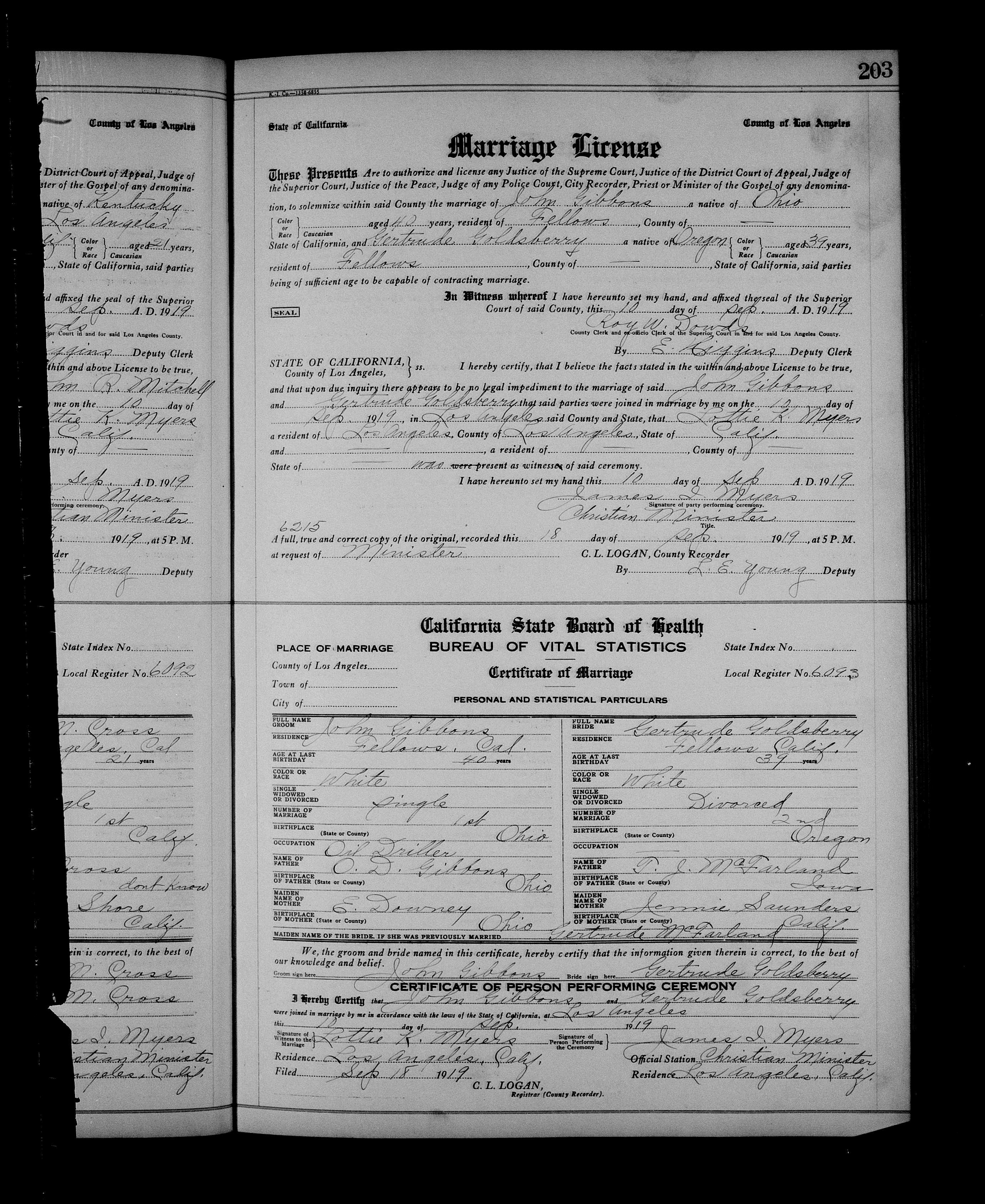 1 "California, County Marriages, 1850-1952," database with images, FamilySearch (https://familysearch.org/search/collection/1804002 : accessed 5 Oct 2022); Name: John Gibbons; Spouse's Name: Gertrude Goldsberry; Marriage Date: 10 Sep 1919; https://www.familysearch.org/ark:/61903/3:1:33S7-9R9G-9ZB4.