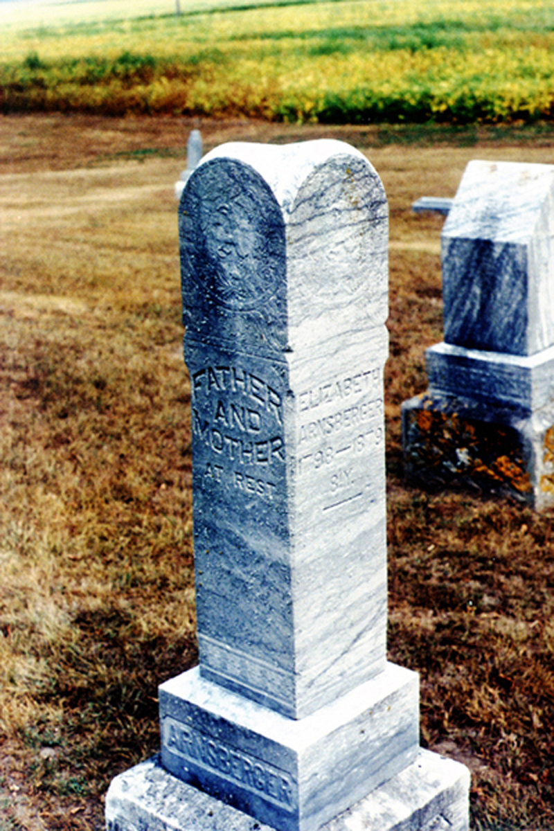 Daniel and his wife, Elizabeth, share one common gravestone in Boynton Cemetery that is a column monument of gray marble approximately 12 inches square and 48 inches tall. At the base, the name ARNSBERGER is carved in relief. Two opposing sides are inscribed "Father and Mother, At Rest". Elizabeth's inscription appears on a third side that reads "Elizabeth Arnsberger, 1798 - 1879, 81y".