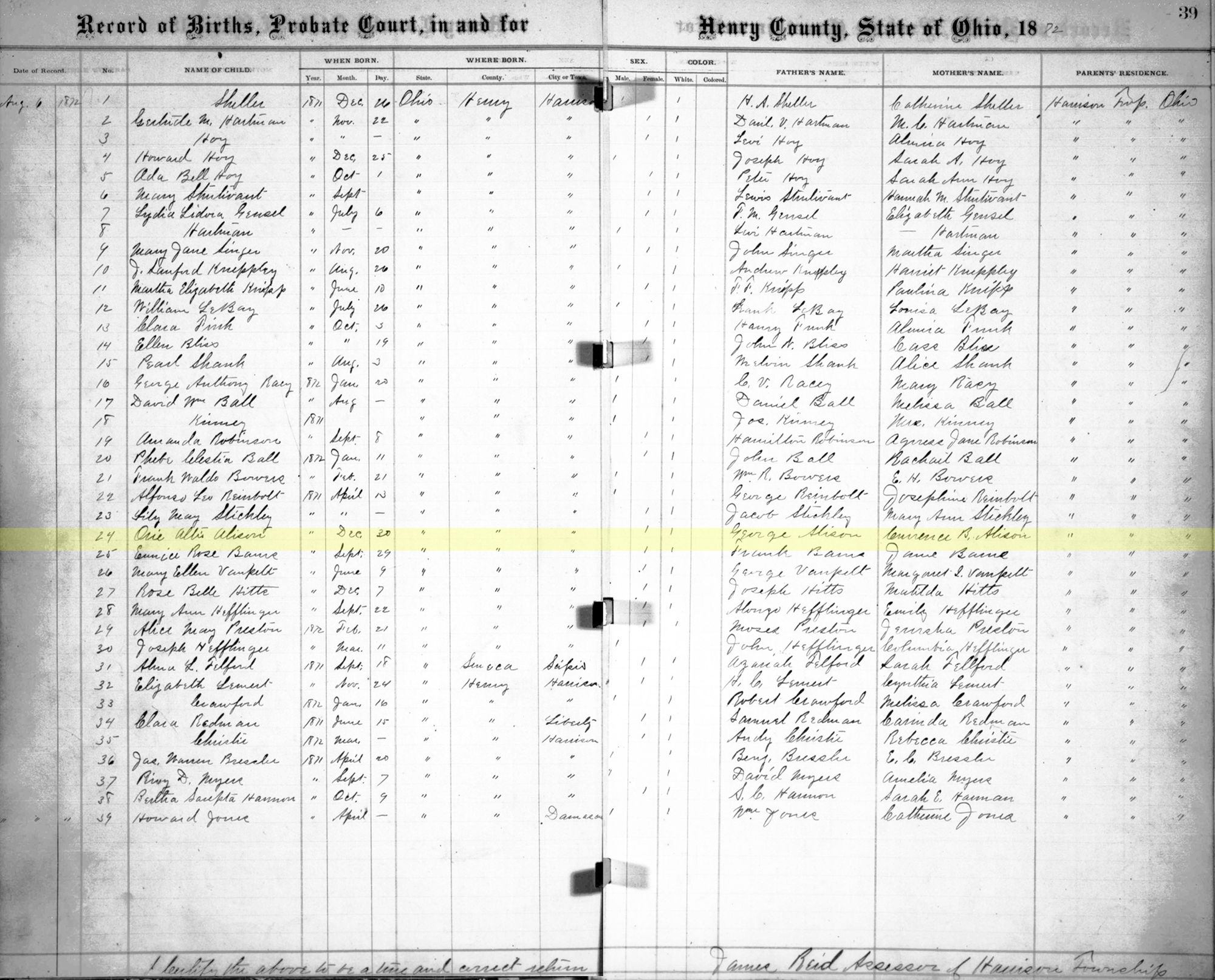 Name: Orie Aita Alison Event Type: Birth Event Date: 30 Dec 1871 Event Place: Harrison, Henry, Ohio, United States Gender: Female Race: W Father's Name: George Alison Mother's Name: Currence B. Alison