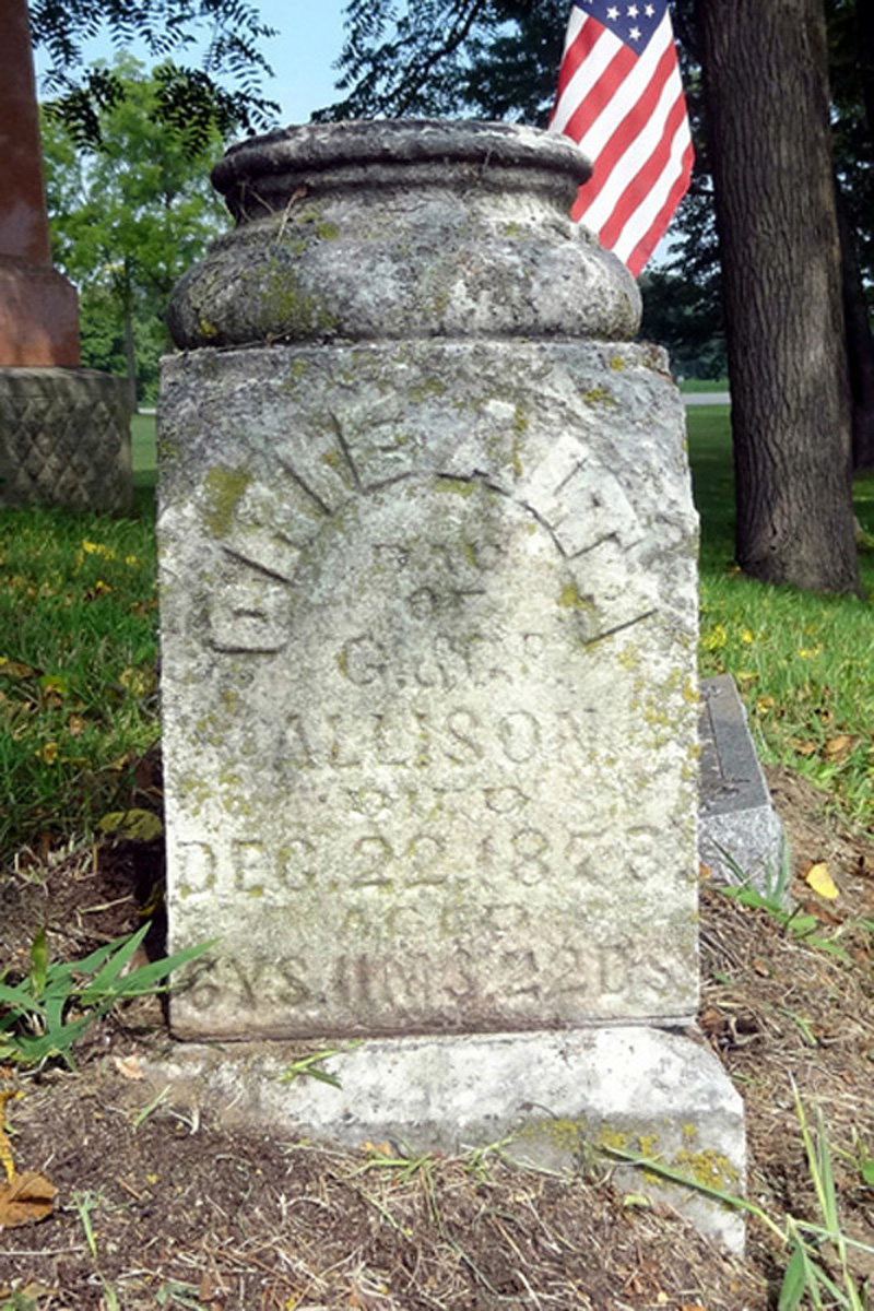 On her grave marker, the name is somewhat difficult to clearly read and appears to be a first and middle name that are very unusual. The letters are cut in relief in a small semicircle. What may be a first and middle name may also be just one long first name (Orieaita?). Her gravestone is a small urn-like monument about 10 inches square at the base and circular shaped at the top with an overall height of about 16 inches. All lettering is quite small and closely packed together. The inscription appears to read "Orie Aita, dau. of G & (?) Allison, Died Dec. 22, 1878, Aged 6y 11m 22d". The gravestone is right next to her parents in Boynton Cemetery. Find A Grave Memorial 73430303 ----------------------------------------------------- . 2