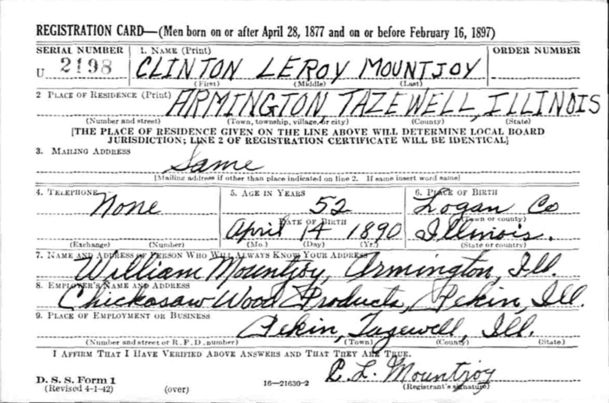 Leola married Clinton Leroy Mountjoy, son of Edward Letcher Mountjoy and Laura Isabella Atteberry, on 10 April 1913 in Armington, IL.1 2 (Clinton Leroy Mountjoy was born on 14 April 1890 in Illinois 2 3 4 5 and died in August 1965.)