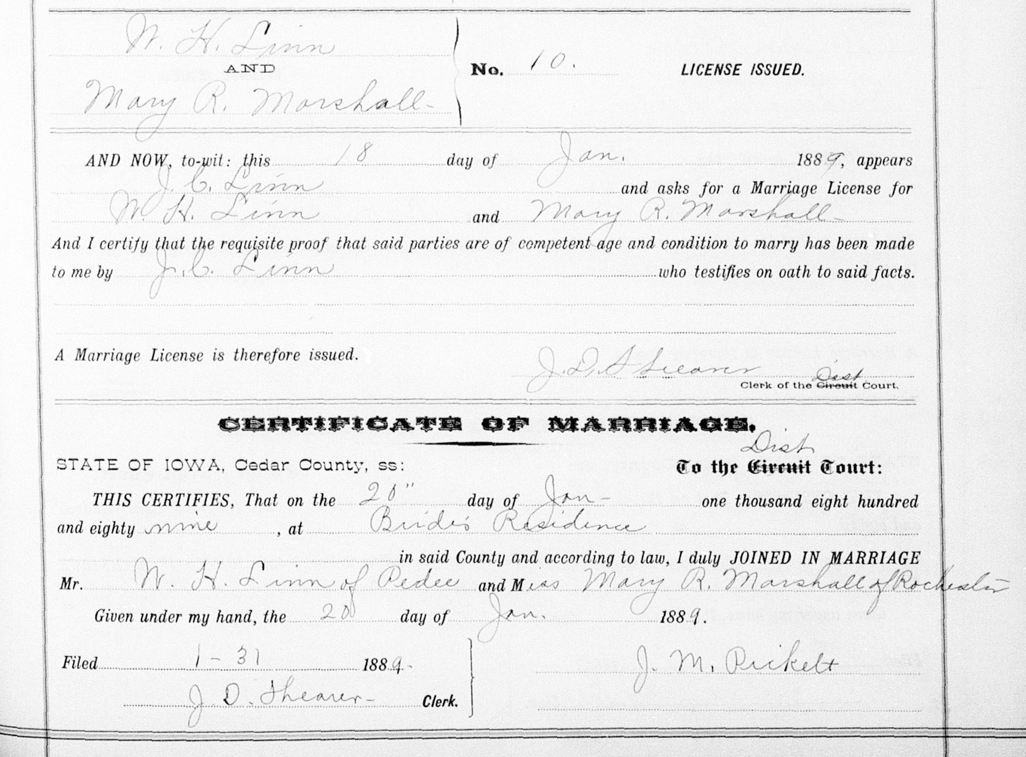 2 "Iowa, County Marriages, 1838-1934," database, FamilySearch (https://familysearch.org/search/collection/1805551 : accessed 26 Jul 2020), W. H. Linn and Mary R. Marshall, 20 Jan 1889, Cedar County, Iowa, United States; citing reference Vol. G. P. 413, county courthouses, Iowa; FHL microfilm 986,806.