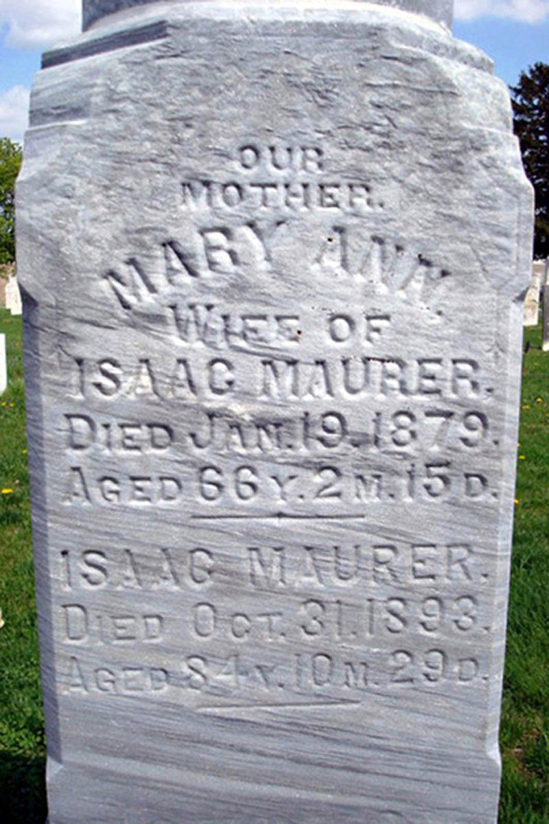 3 1850 U.S. census, population schedule, Ballville Township, Sandusky County, Ohio, p. 438A, dwelling 649, family 660, Isaac Maurer and Mary ann Ernsberger; index and images, FamilySearch.org (accessed 28 Mar 2014); citing National Archives and Records Administration microfilm M432.