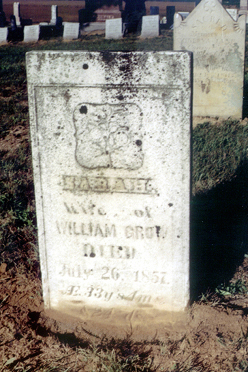 • She was buried after 26 July 1857 in the Bethany Cemetery in Washington, IN. Sarah married William Grow, son of Christopher Grow and Mary Arnspiger, on 20 January 1847 in Washington, IN.1 2 (William Grow was born in 1824 in Kentucky,4 5 6 7 died on 3 August 1903 in Topeka, KS 1 7 8 and was buried after 3 August 1903 in Topeka, KS 7.)