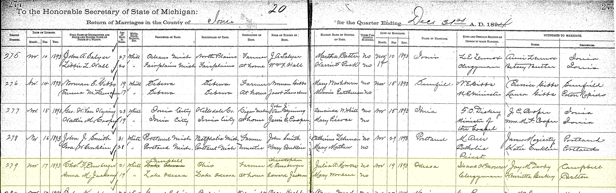 • Marriage Image: 19 November 1893, in Odessa Township, Ionia, MI. 1