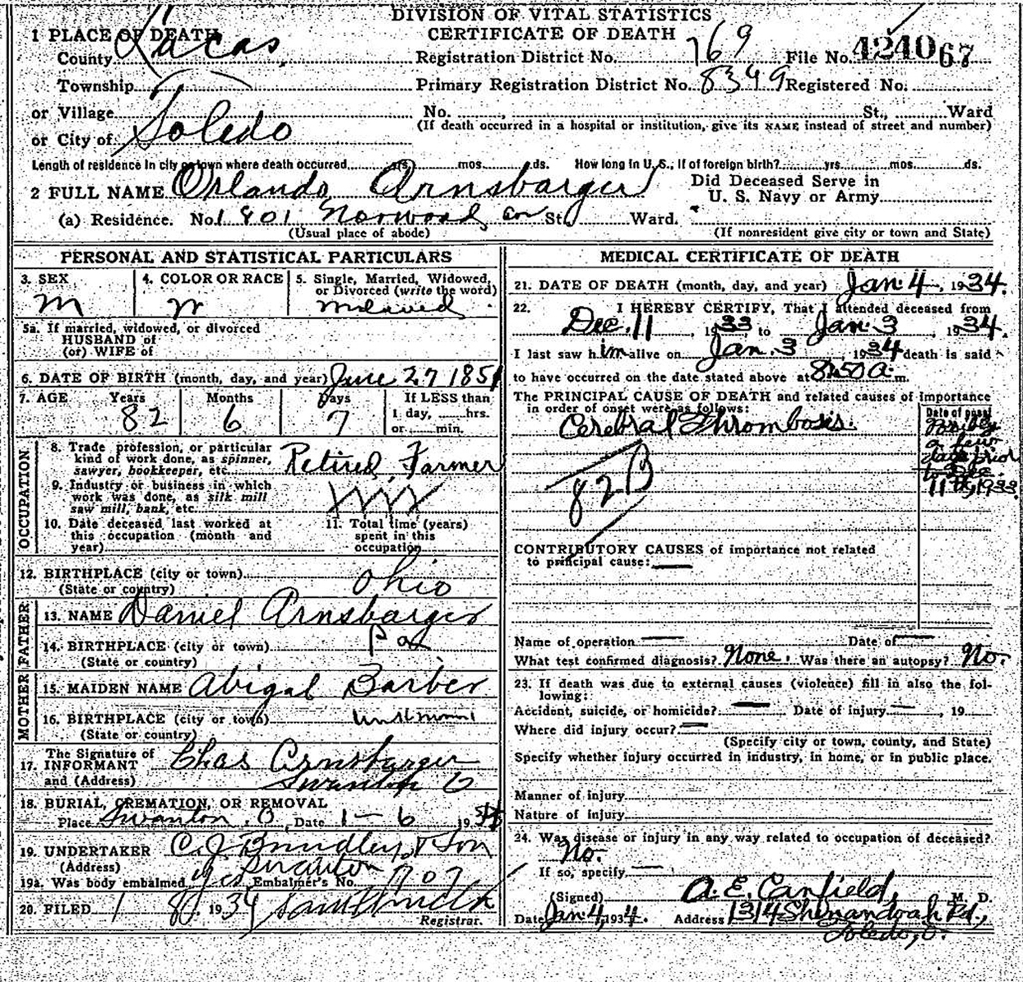 Name: Orlando Arnsbarger Event: Death Event Date: 04 Jan 1934 Event Place: Toledo, Lucas, Ohio Residence: Toledo, Lucas, Ohio Street Address: 1801 Norwood Gender: Male Death Age: 82y 6m 7d Marital Status: Married Race: w Occupation: Retired Farmer Birth Date: 27 Jun 1851 Birthplace: Ohio Estimated Birth Year: 1852 Burial Date: 06 Jan 1934 Burial Place: Swanton, Ohio Father: Daniel Arnsbarger Father's Birthplace: Pa Mother: Abigal Barber Reference Number: fn 4240 Film Number: 1992987 Digital Folder Number: 4020582 Image Number: 1375