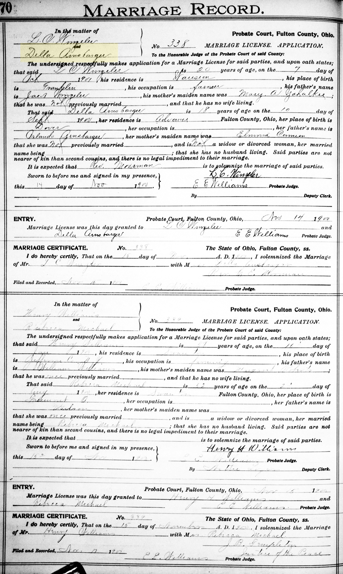 • Marriage Image: 15 November 1900, in , Fulton County, OH. • They appeared on the 1910 US Census in Swan Creek Township, Fulton County, OH on 15 April 1910. 1 • They appeared on the 1920 US Census in Swan Creek Township, Fulton County, OH on 23 January 1920. 2