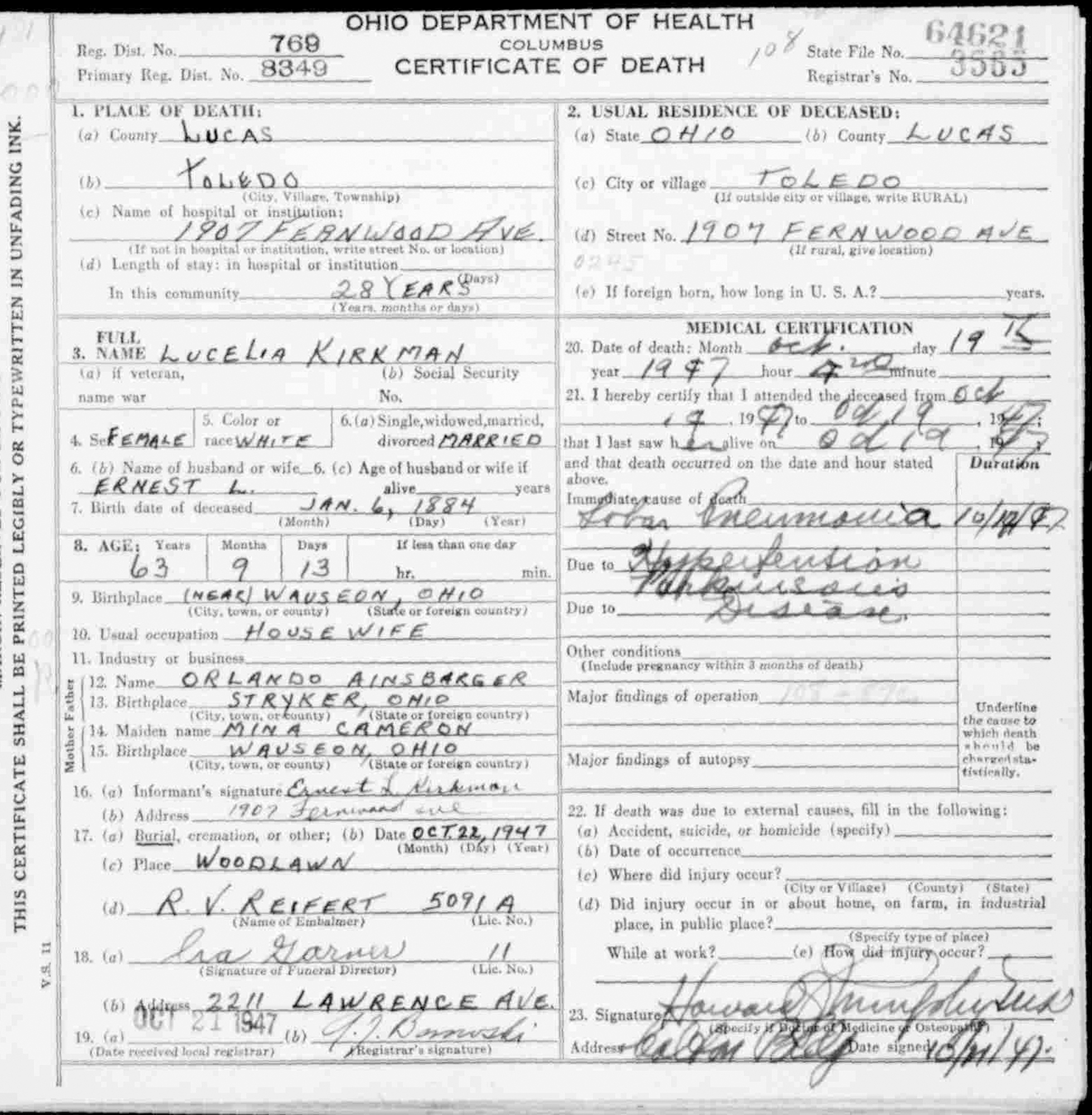 5 "Ohio Deaths, 1908-1953," database with images, FamilySearch.org (accessed 24 February 2021), (https://familysearch.org/ark:/61903/1:1:X6V8-6V2 : 10 July 2020), Lucelia Kirkman, 19 Oct 1947; citing, reference certificate; FHL microfilm 2,372,993.