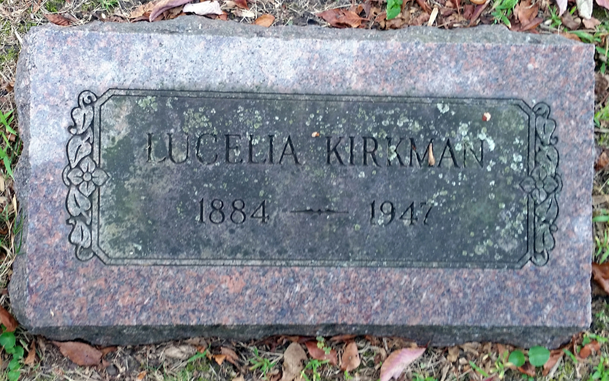 6 Find A Grave, database and images (https://www.findagrave.com/ ); (accessed 28 November 2019), memorial page for Lucelia Arnsberger Kirkman (4 Jan 1884-19 Oct 1947), Find A Grave Memorial no. 152475286, citing Woodlawn Cemetery, Toledo, Lucas County, Ohio, USA