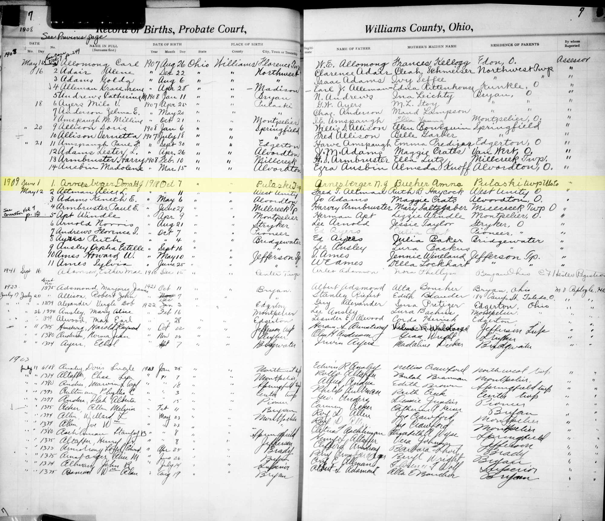 • Birth Image: 7 October 1908, in Pulaski Township, Williams County, OH. • He appeared on the 1920 US Census in Stryker, OH on 8 January 1920. 2