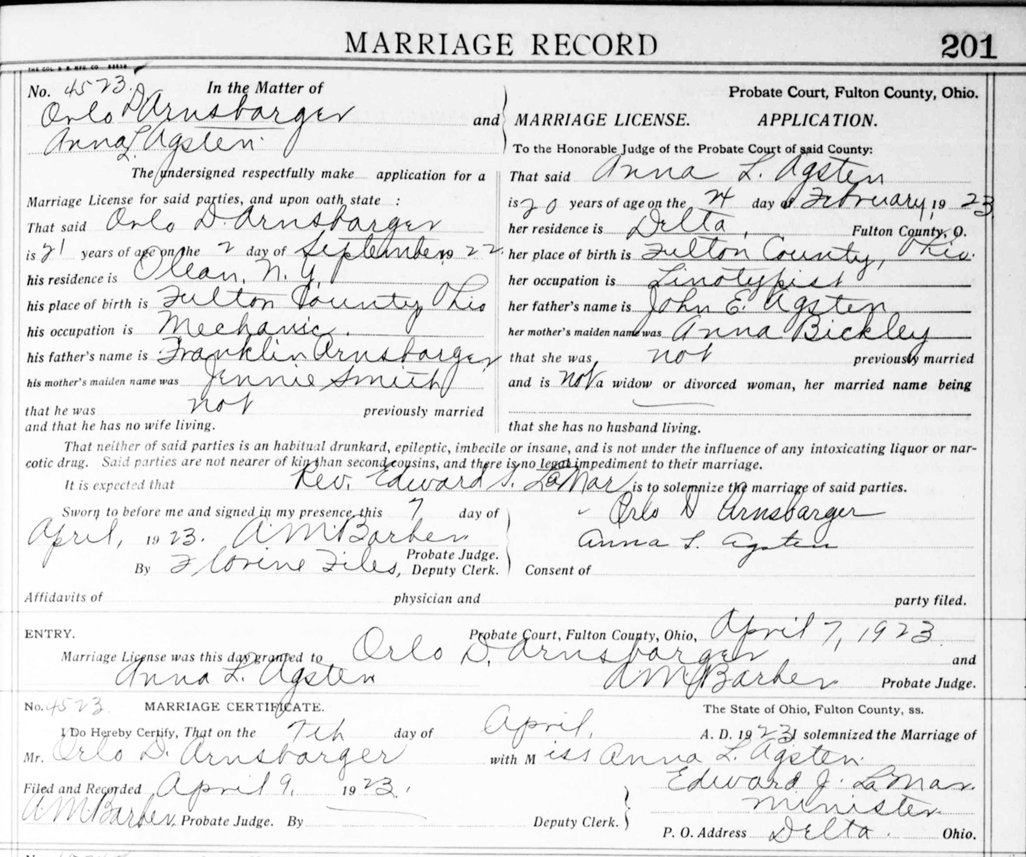 Name: Orlo D. Arnsbarger Event Type: Marriage Event Date: 07 Apr 1923 Event Place: Fulton, Ohio, United States Age: 21 Birth Date: 2 Sep Birth Year (Estimated): 1902 Birthplace: Fulton County, Ohio, United States Father's Name: Franklin Arnsbarger Mother's Name: Jennie Smith Spouse's Name: Anna L. Agsten Spouse's Age: 20 Spouse's Birth Year (Estimated): 1903 Spouse's Birthplace: Fulton County, Ohio, United States Spouse's Father's Name: John E. Agsten Spouse's Mother's Name: Anna Bickley