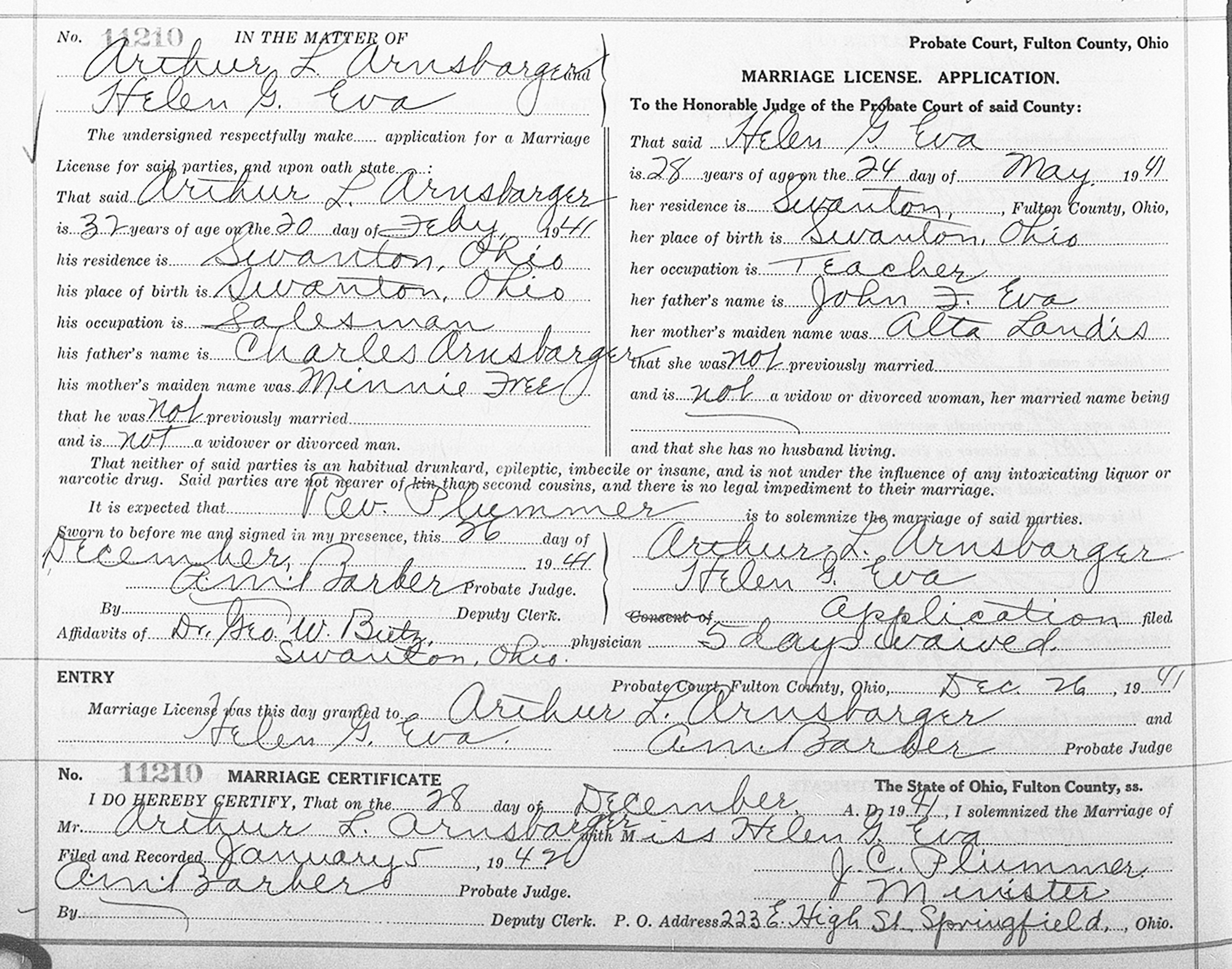 • Marriage Image: 28 December 1941, in , Fulton County, OH.