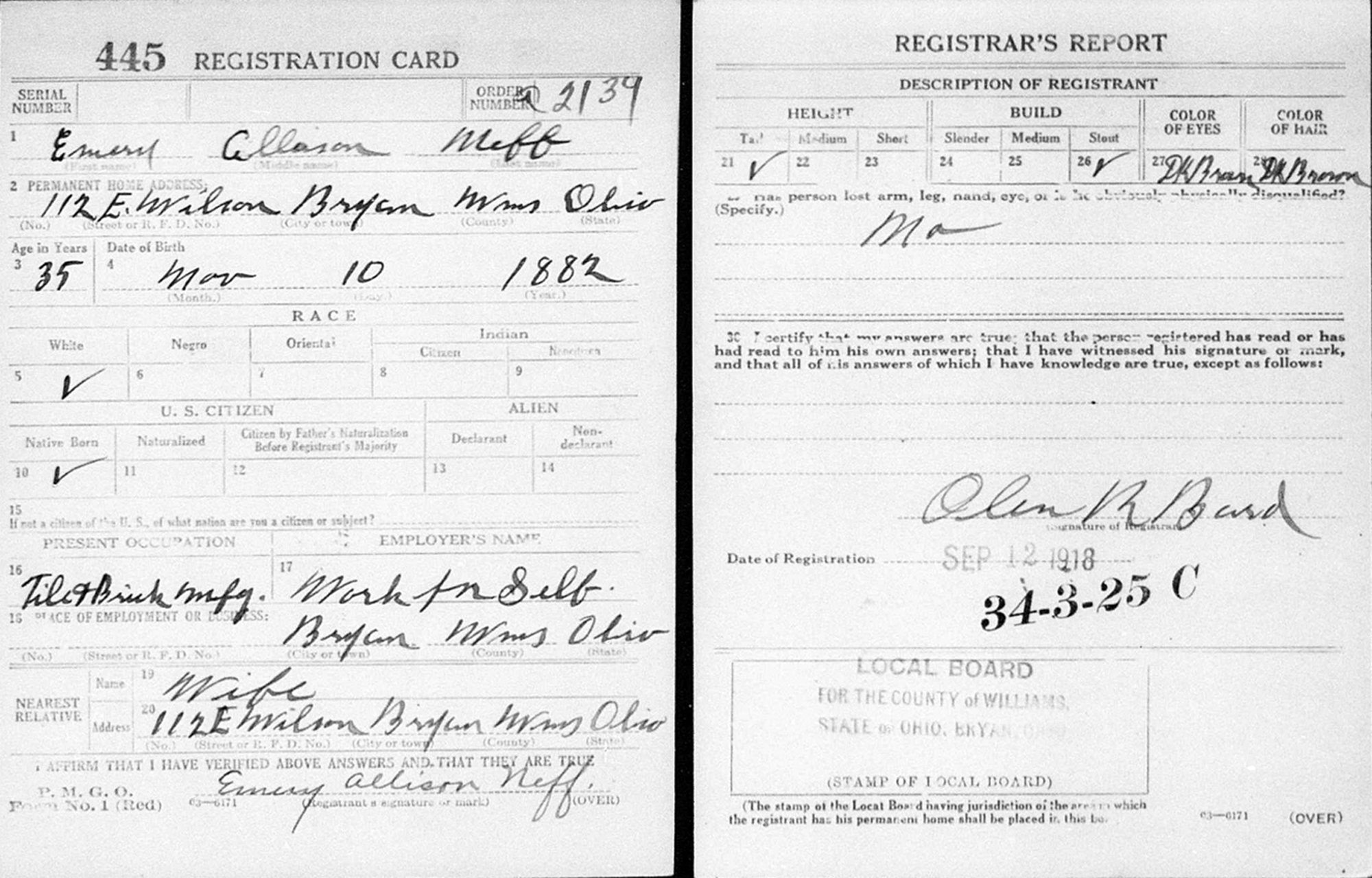 3 "United States World War I Draft Registration Cards, 1917-1918," database with images, FamilySearch.org (accessed 9 Jul 2019); Emery Allison Neff.