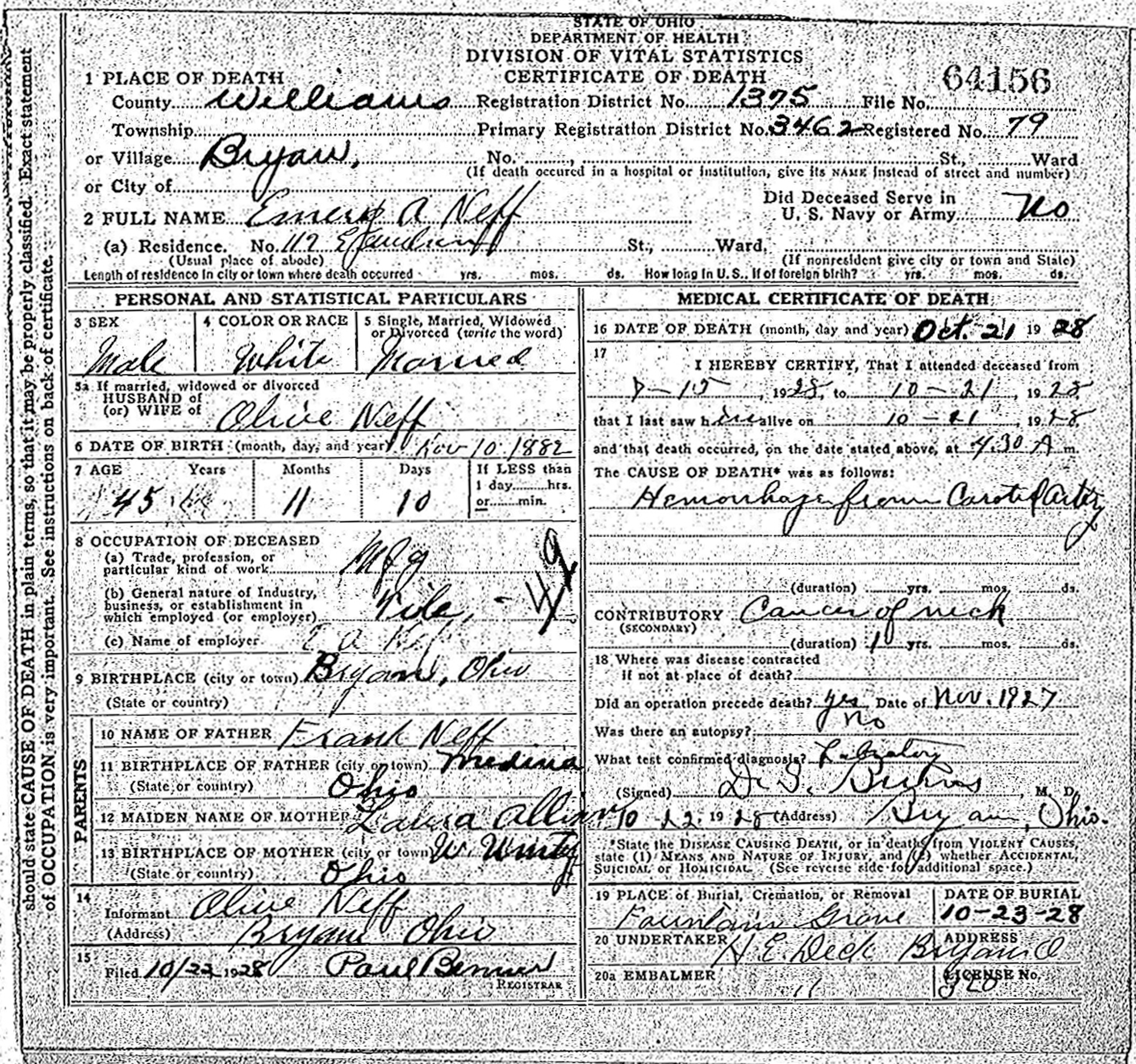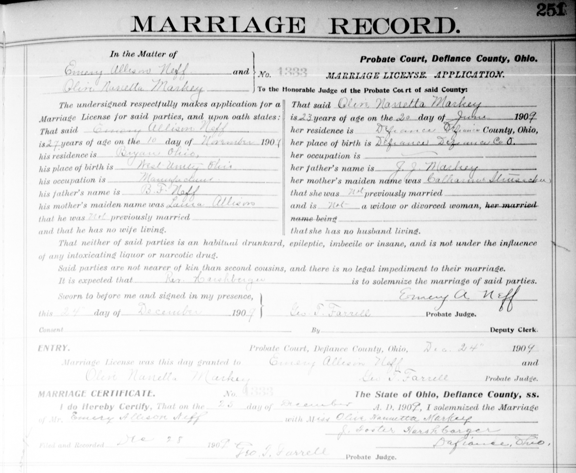 2 1920 U.S. census, population schedule, Bryan, Williams County, Ohio, enumeration district (ED) 164, sheet 4B, dwelling 103, family 104, Emery Allison Neff and Olive Nanetta Markey; index and images (accessed 3 Mar 2018); citing National Archives and Records Administration microfilm T625, roll 1450.