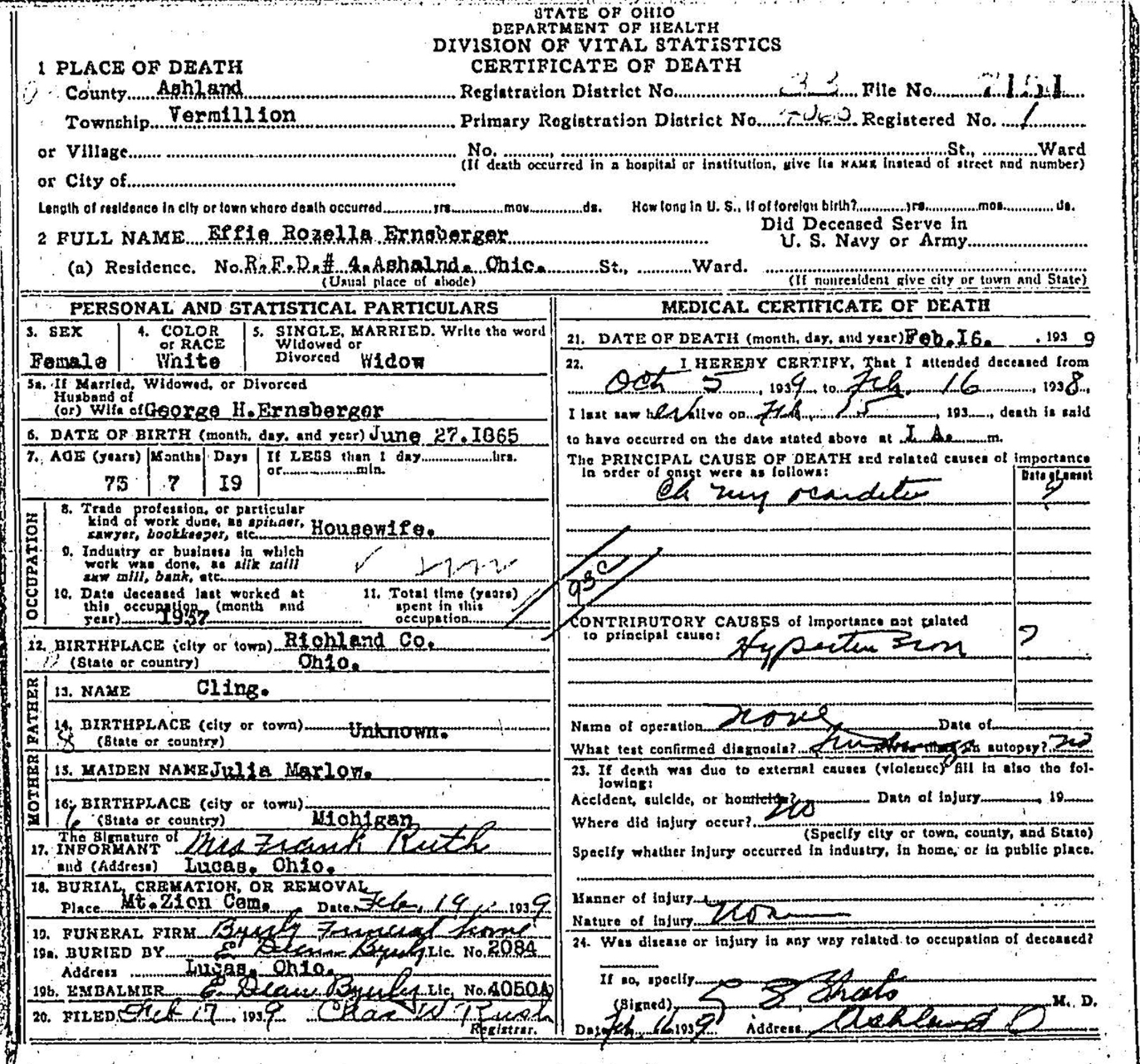 7 "Ohio Deaths, 1908-1953," database with images, FamilySearch.org (accessed 4 Apr 2014), Name: Effie Rosella Ernsberger; Event Date: 16 Feb 1939; Event Place: Vermillion, Ashland, Ohio.