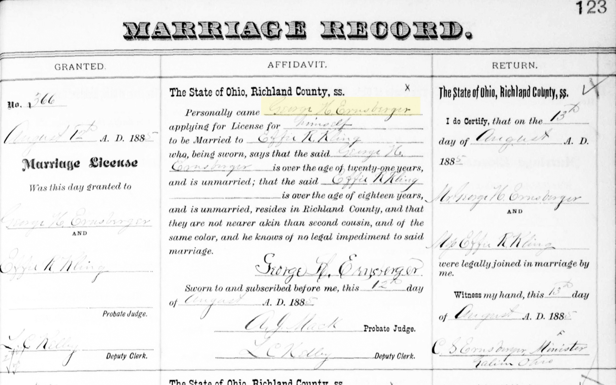 1 "Ohio, County Marriages, 1789-2016," database with images, FamilySearch.org (accessed 3 Apr 2014); Name: George H Ernsberger; Spouse's Name: Effie R Kling; Event Date: 13 Aug 1885; Event Place: Richland, Ohio.