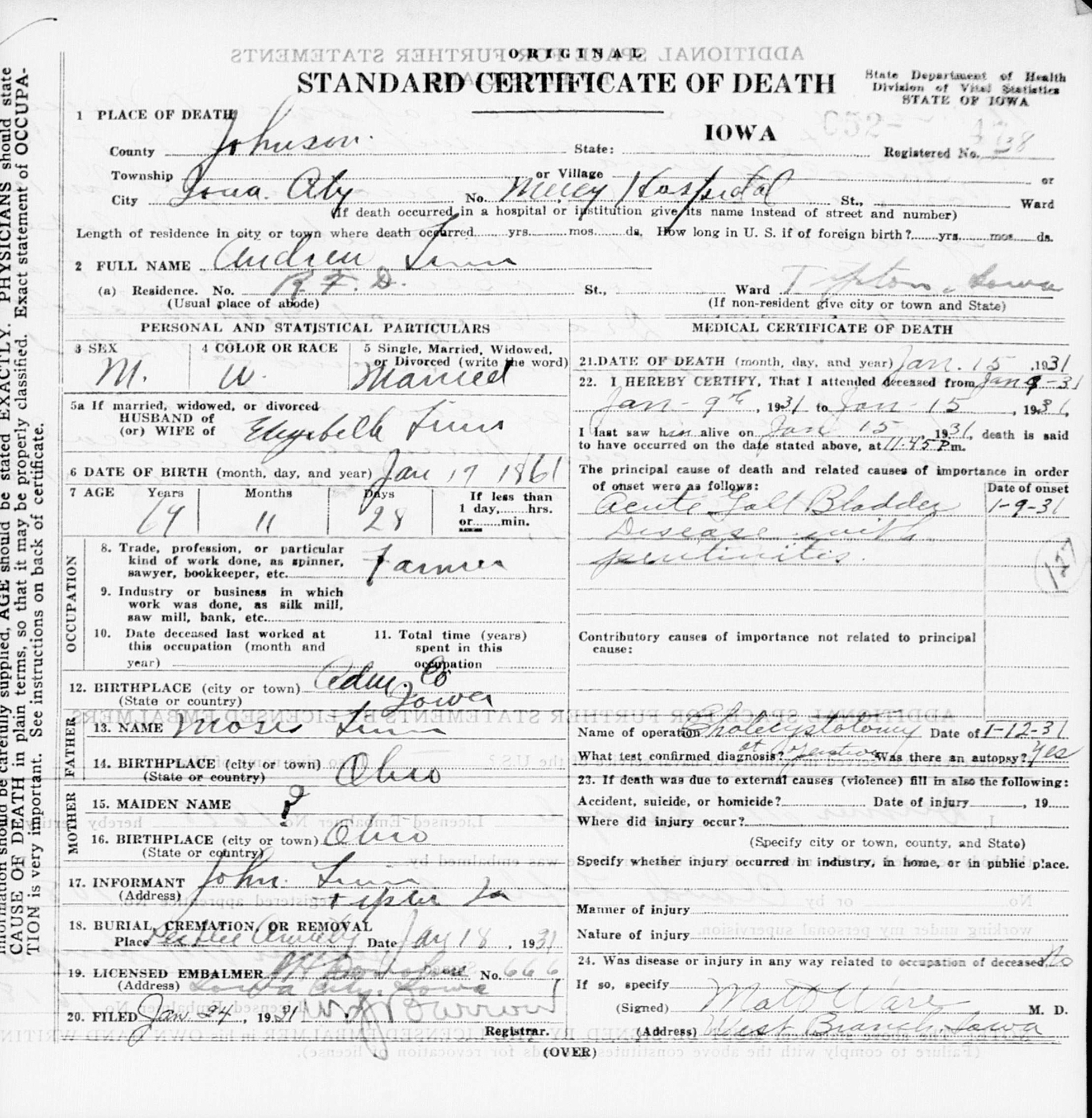 15 "Iowa, Death Records, 1904-1951," database with images, FamilySearch (https://www.familysearch.org/search/collection/2531337 : accessed 24 Jul 2020), Andrew Linn, 15 Jan 1931, Iowa, Iowa, United States; citing certificate #5247, State Historical Society of Iowa, Des Moines; FamilySearch digital folder 101797043.