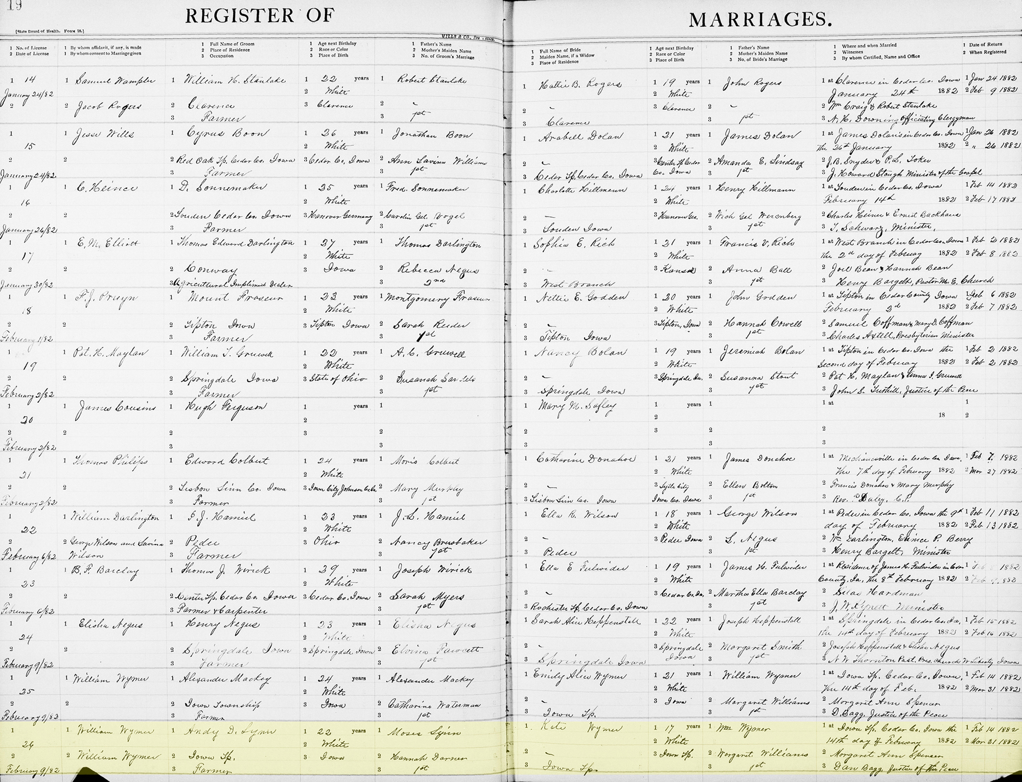 1 "Iowa, County Marriages, 1838-1934," database, FamilySearch (https://familysearch.org/search/collection/1805551 : accessed 23 Jul 2020), Andy D. Lynn and Kate Wymer, 14 Feb 1882, Iowa Tp., Cedar, Iowa, United States; citing reference BK 1 P 19 CN 26, county courthouses, Iowa; FHL microfilm 1,737,784.